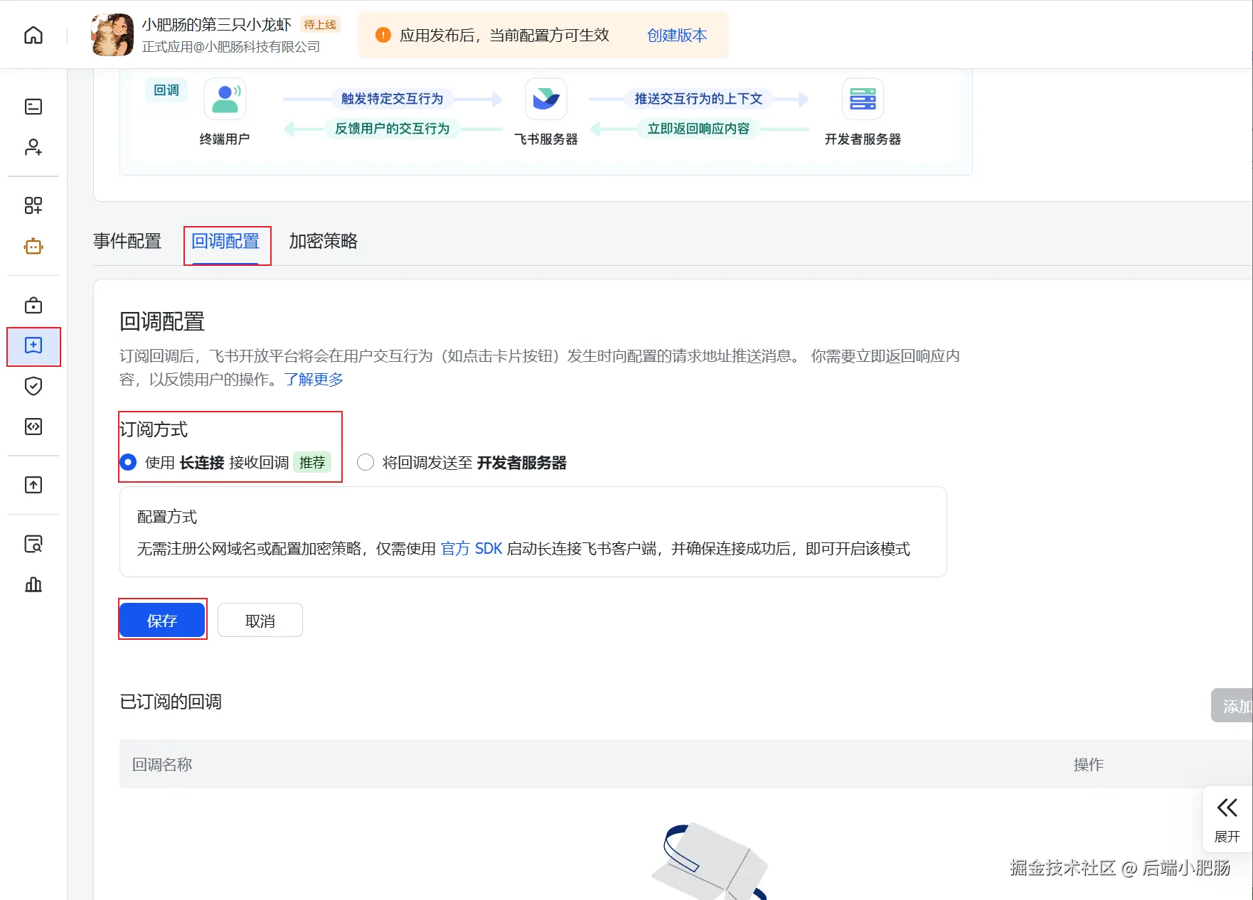 点击 【 回调 配置】---【订阅方式】 旁边的小笔。选择使用长链接接收回调 ,点击 【保存】 按钮。