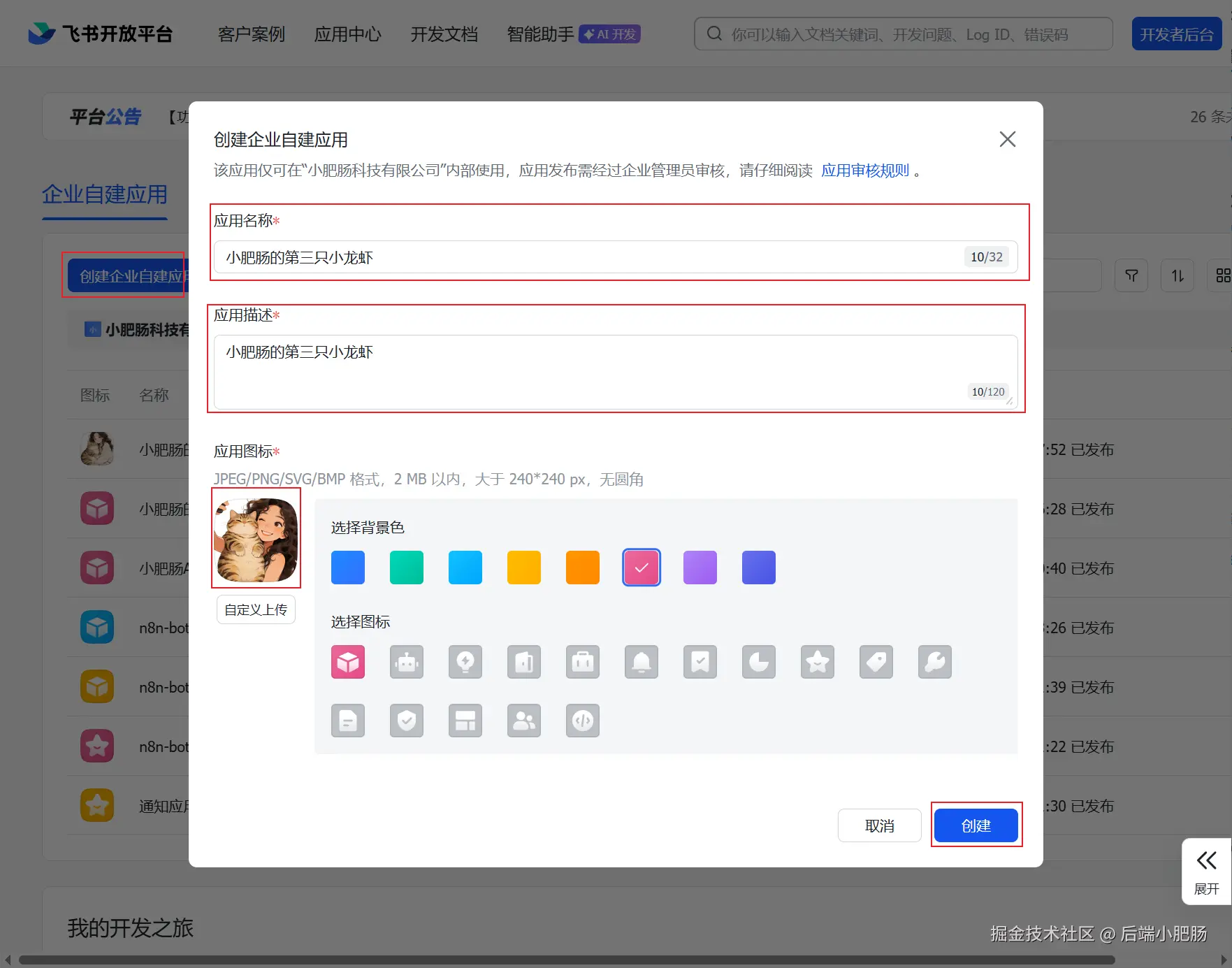 来到飞书开放平台(open.feishu.cn/app?lang=zh... 【创建企业 自建应用 】 ,在新增弹窗中输入 【应用名称】 、 【应用描述】 、上传应用应用图标,点击 【创建】 按钮。