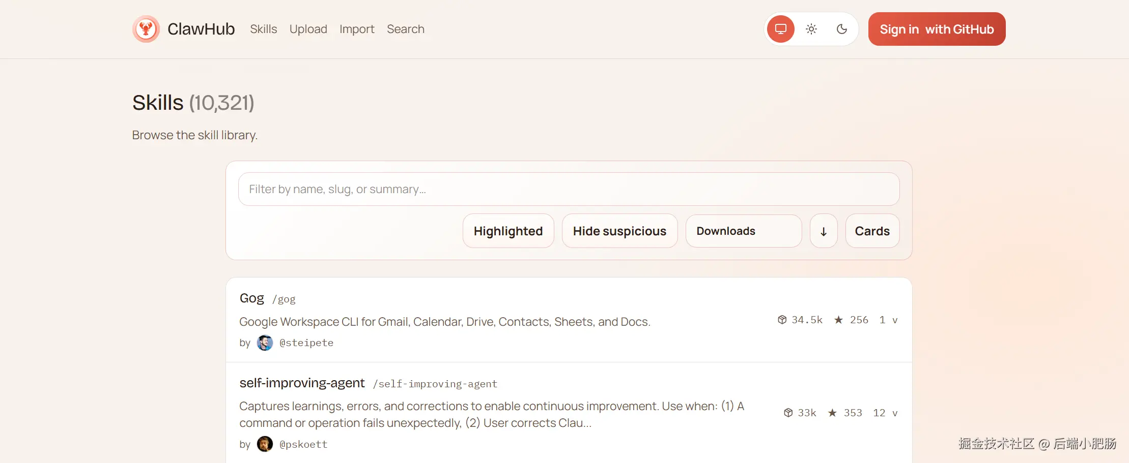 技能名称的获取可点击 【获取更多Skills?】 按钮,网页会跳转到ClawHub,在这里可以搜索我们想要的技能,把名称复制,粘贴过去就行。