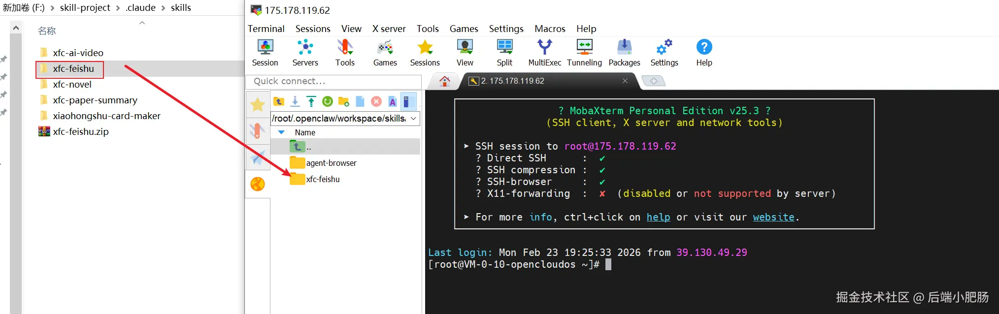 这种方式适合集成你自己创建的skill。只要将skill文件拖动到服务器的/root/.OpenClaw/workspace/skills/目录即可。