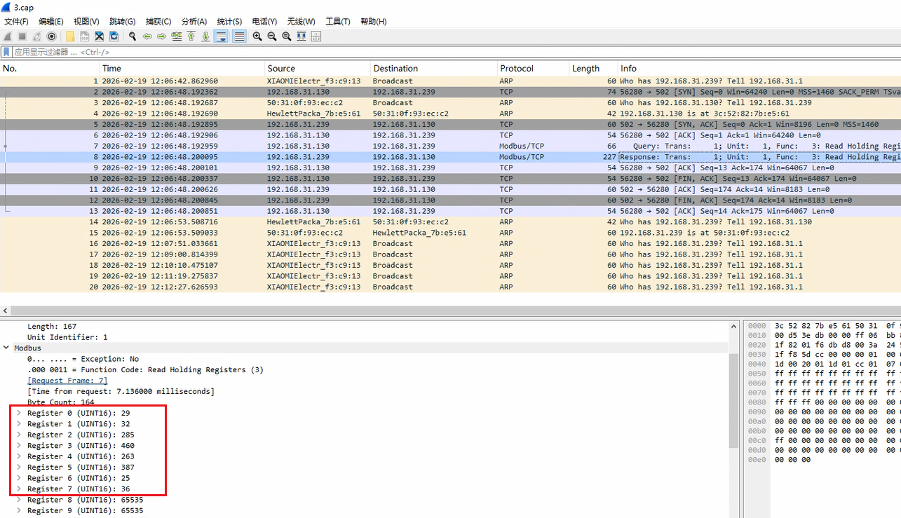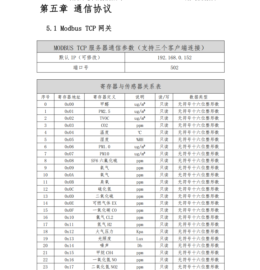 某空气质量传感仪,支持Modbus-TCP协议。也就是说其支持通过Modbus-TCP协议读取寄存器,来读到相关传感器的值: