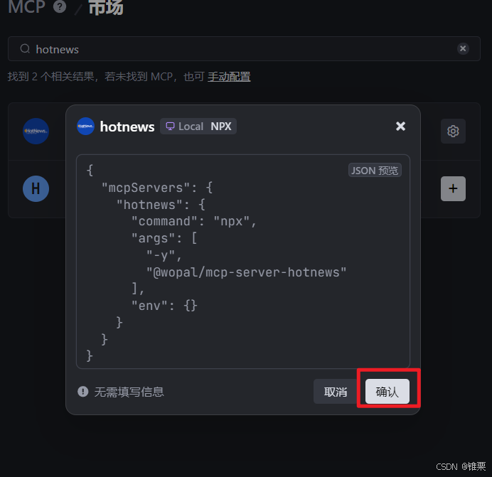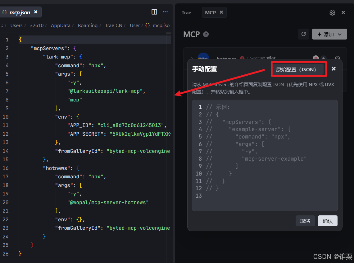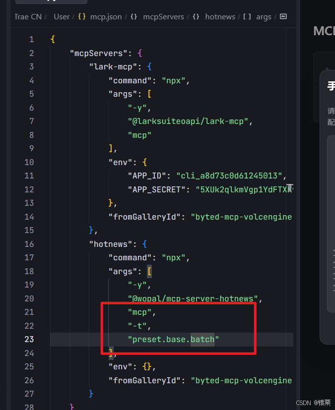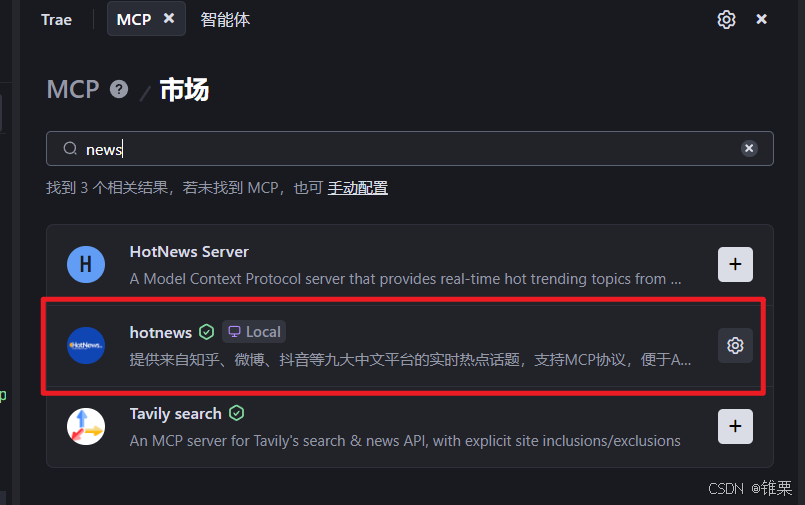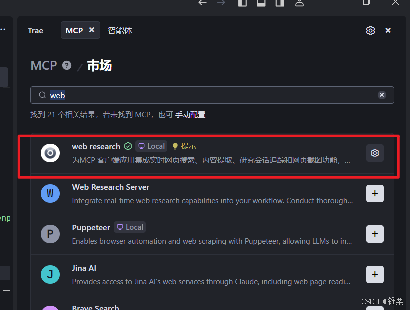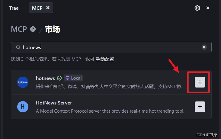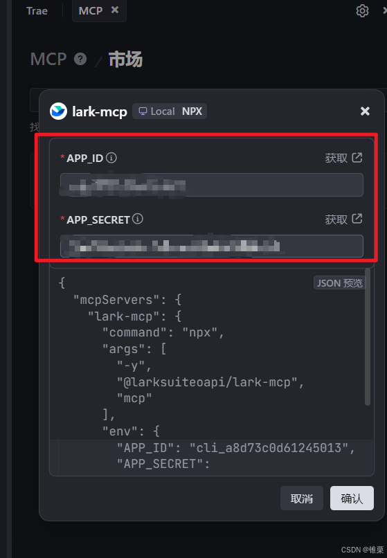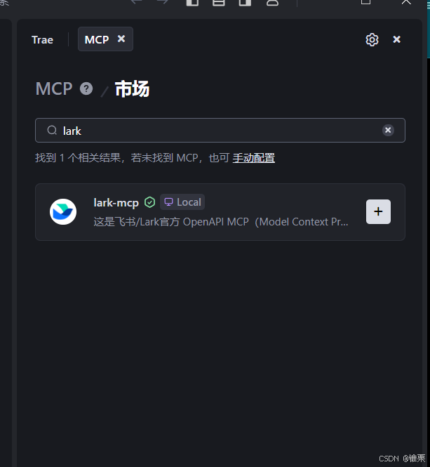 在Trae中,打开MCP的市场,搜索lark,并添加上飞书的MCP