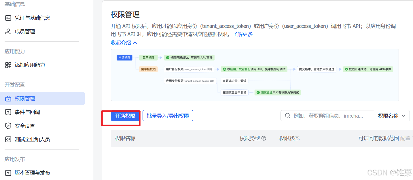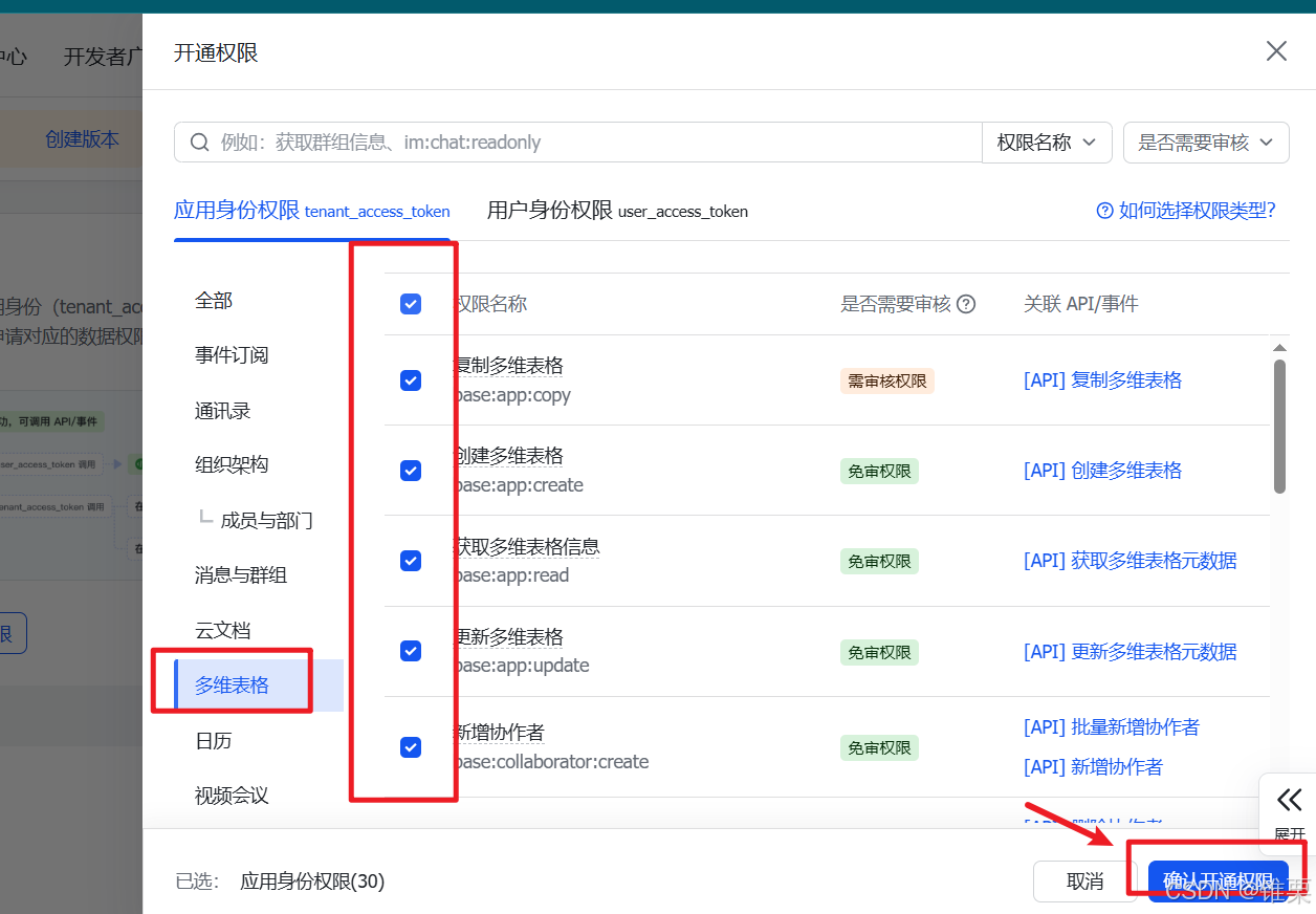 把多维表格中的所有权限都勾选上,然后点击"确认开通权限"