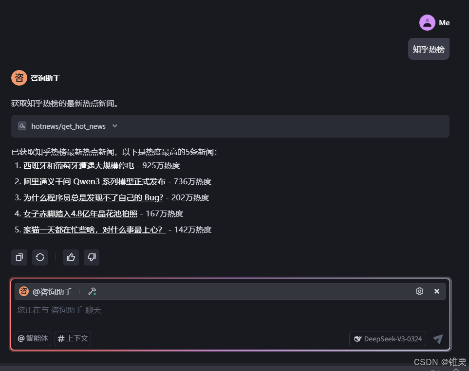 1、调用hotnews工具,获取平台的热点资讯,具体哪个平台由用户决定。如果用户没有指定平台,默认是知乎热榜。
