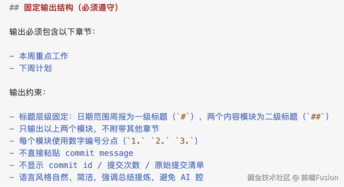 → 输出固定结构(本周完成 / 风险阻塞 / 下周计划)