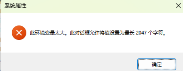 超出长度限制会报错"此环境变量太大。此对话框允许将值设置为最长2047个字符"