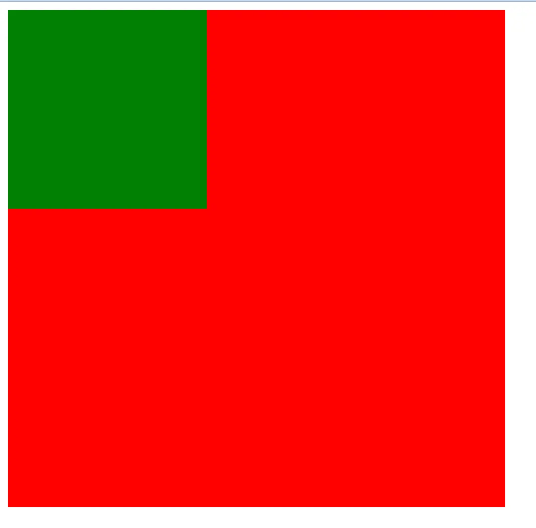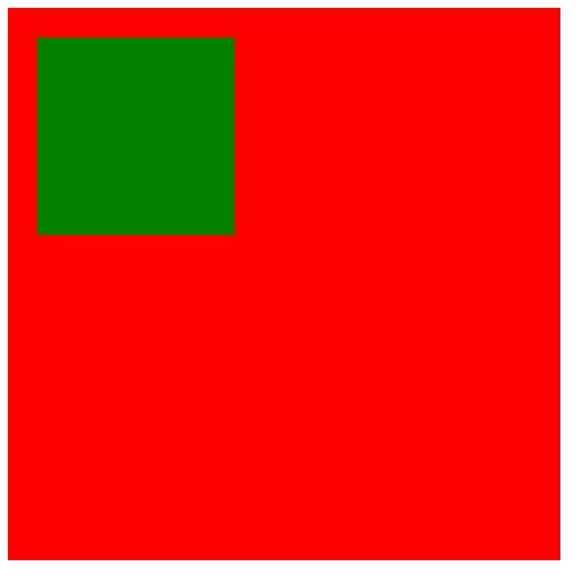 html<!DOCTYPE html> <html> <head> <meta charset="utf-8"> <title>边距属性练习</title> <style> .outBox { background-color: red; width: 500px; height: 500px; border: 1px solid #000; } .inBox { background-color: green; width: 200px; height: 200px; margin: 30px; } </style> </head> <body> <div class="outBox"> <div class="inBox"></div> </div> </body> </html> -