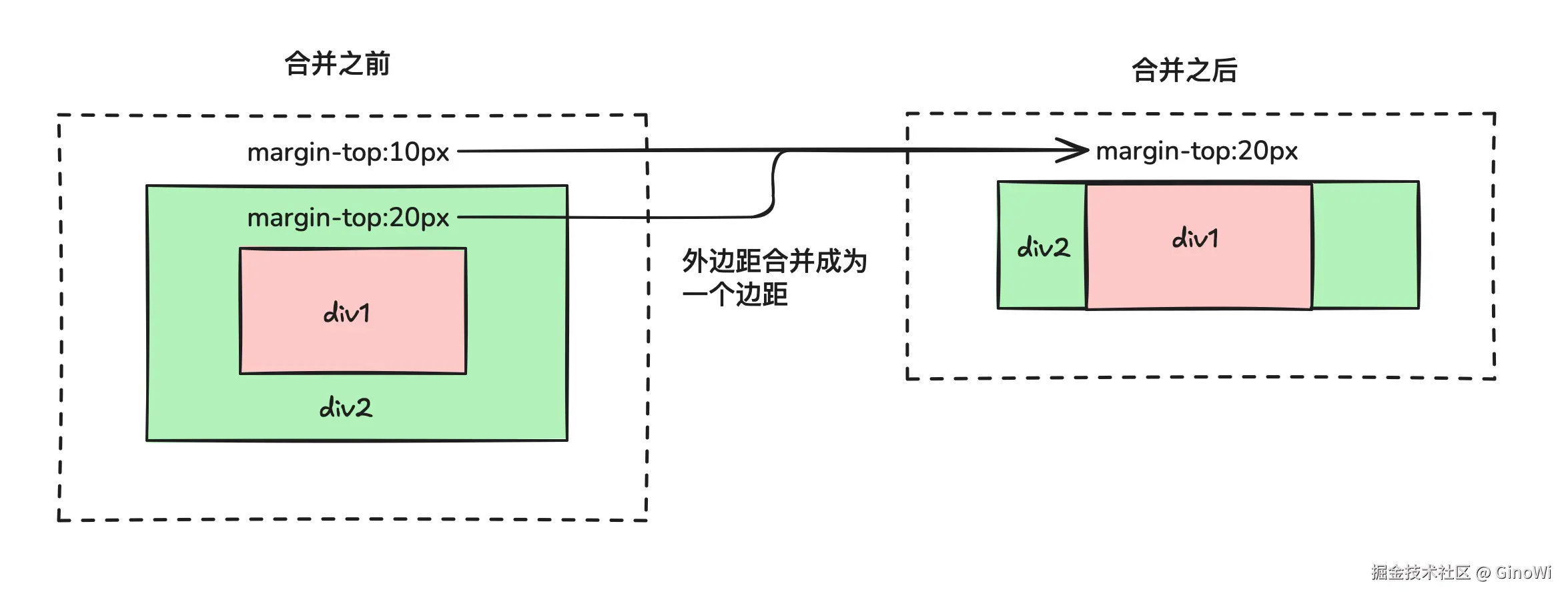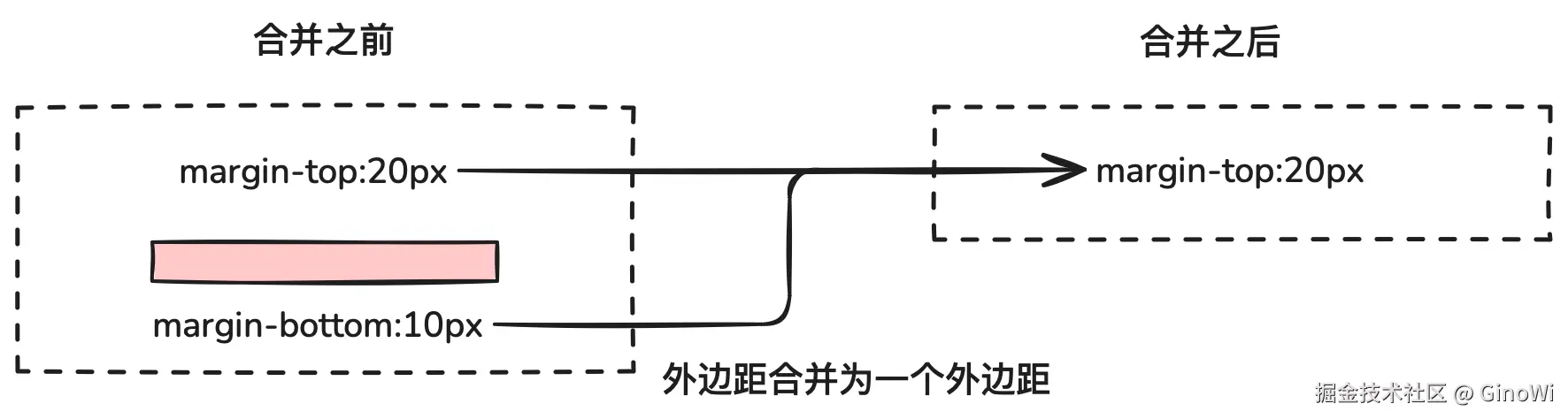 外边距合并的现象简单来说就是当两个垂直方向的外边距相遇,会形成一个外边距,此外边距大小为两个边距中的最大值(如果两者相等则取其中一个)。