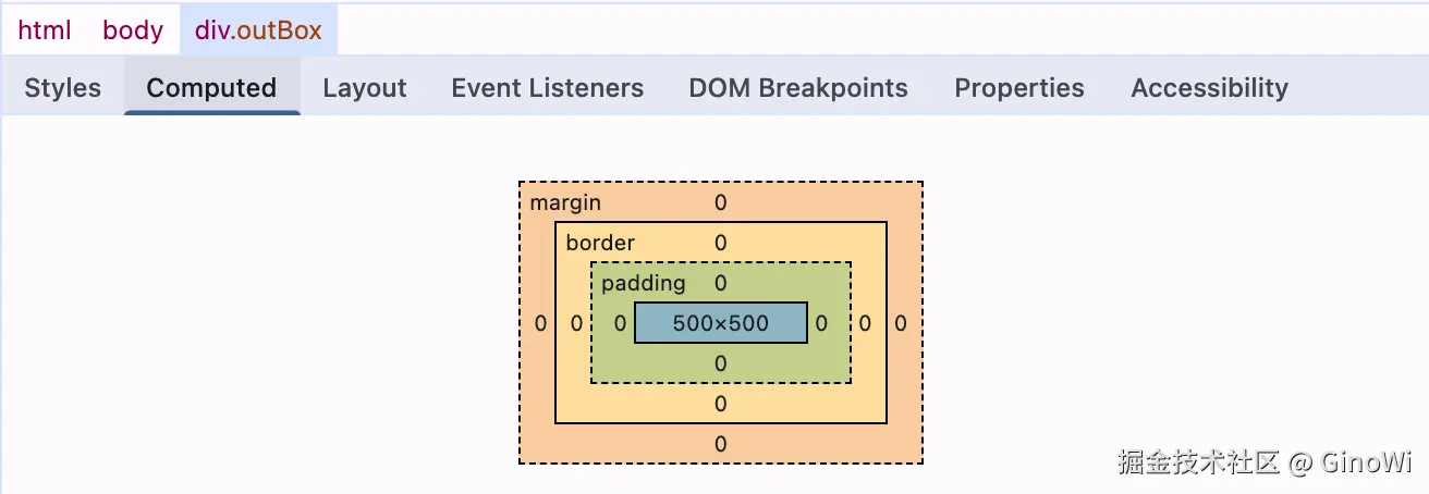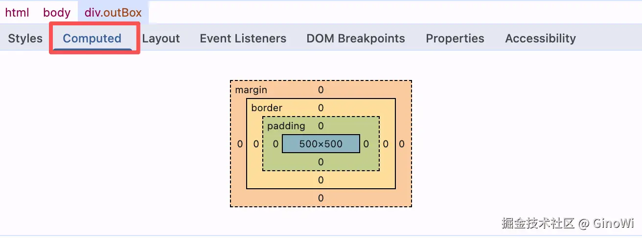 可以通过开发者工具中的Computed面板观察外面红色盒子的样式: