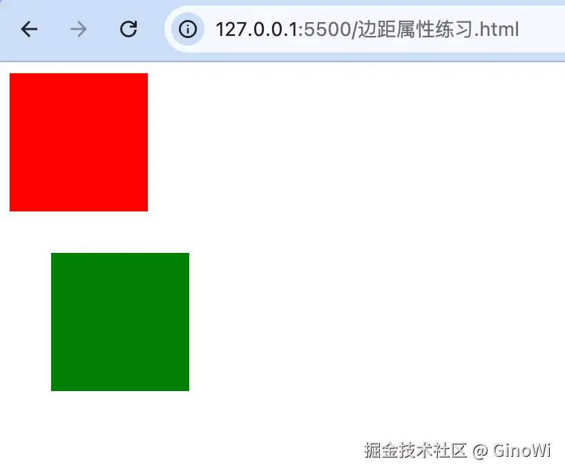 html<!DOCTYPE html> <html> <head> <meta charset="utf-8"> <title>边距属性练习</title> <style> .box1 { background-color: red; width: 100px; height: 100px; } .box2 { background-color: green; width: 100px; height: 100px; margin: 30px; } </style> </head> <body> <div class="box1"></div> <div class="box2"></div> </body> </html>