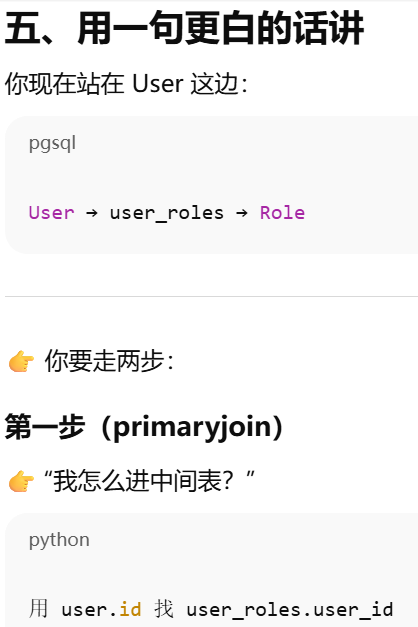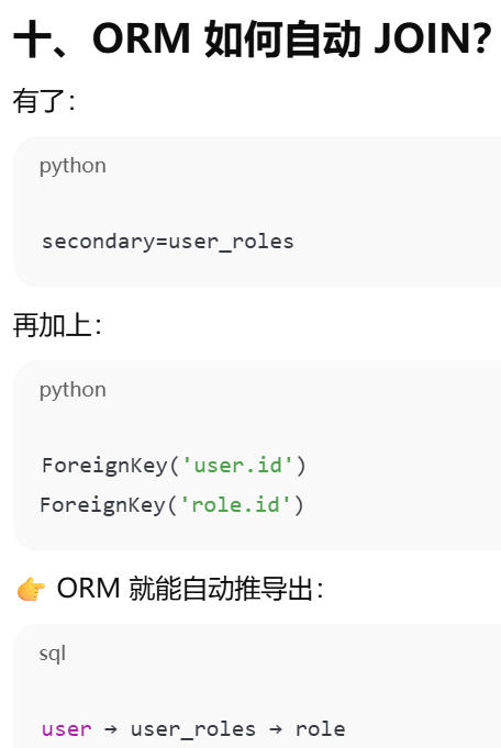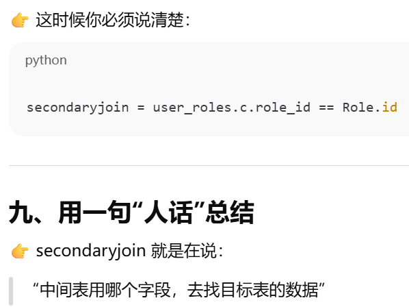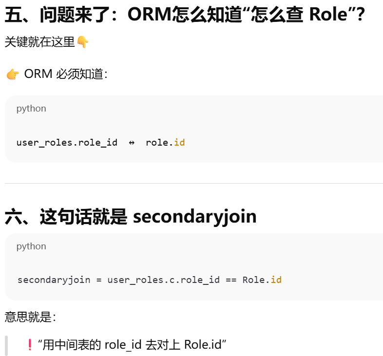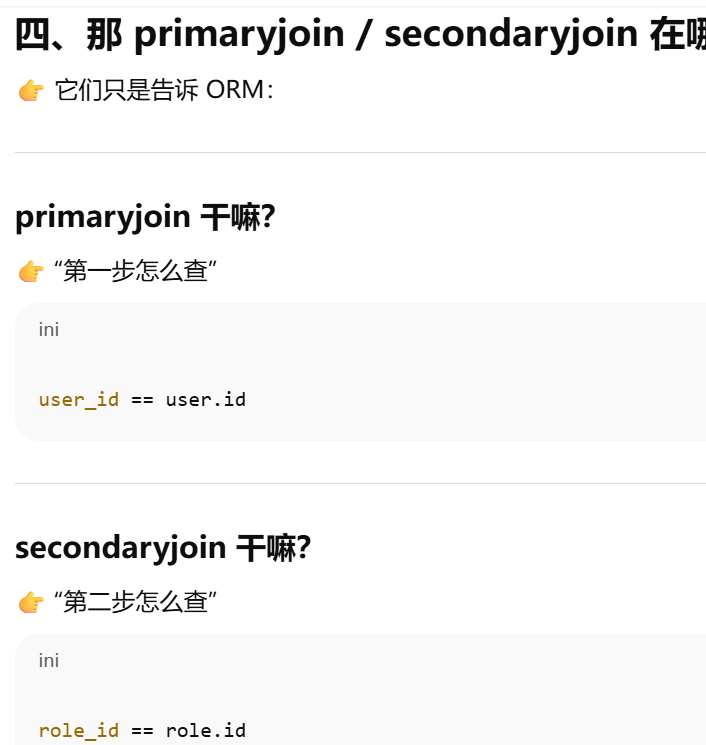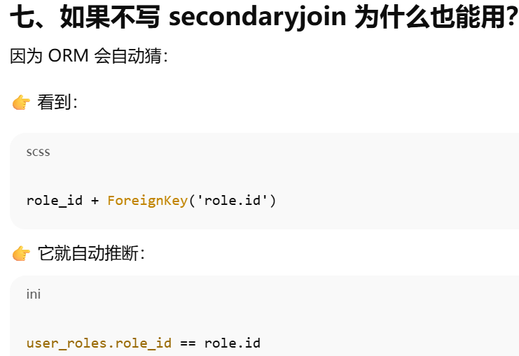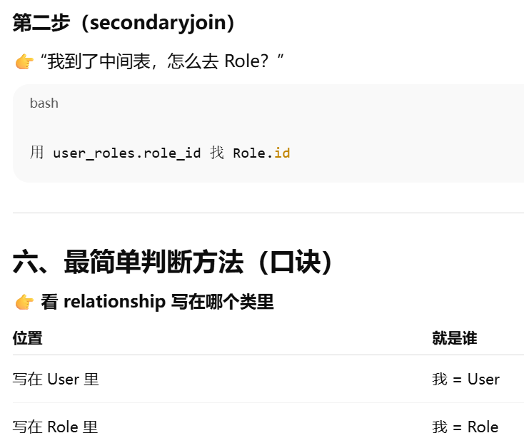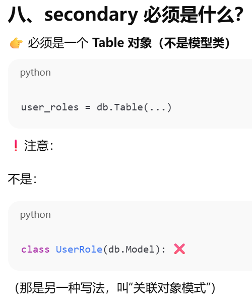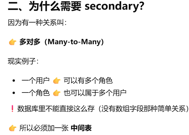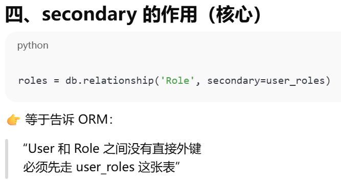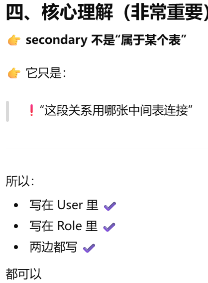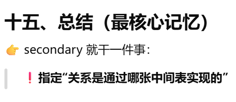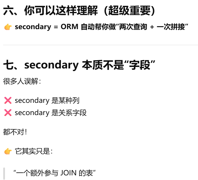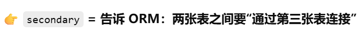- [secondary ------ 告诉 ORM:两张表之间要"通过第三张表连接"](#secondary —— 告诉 ORM:两张表之间要“通过第三张表连接”)