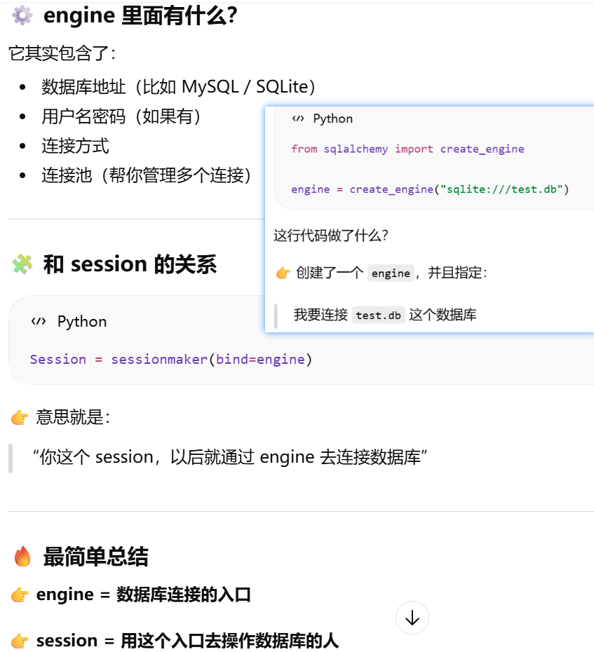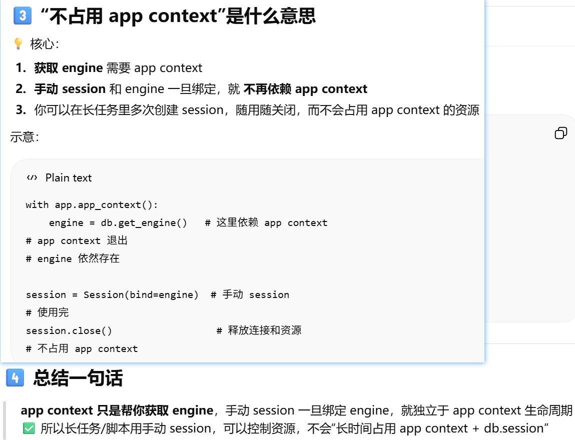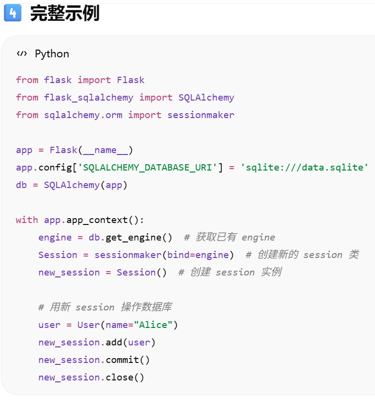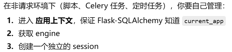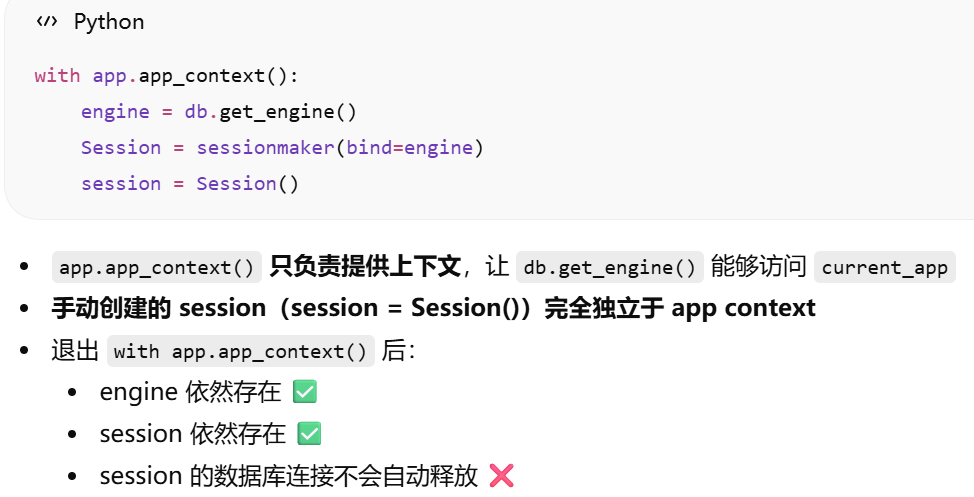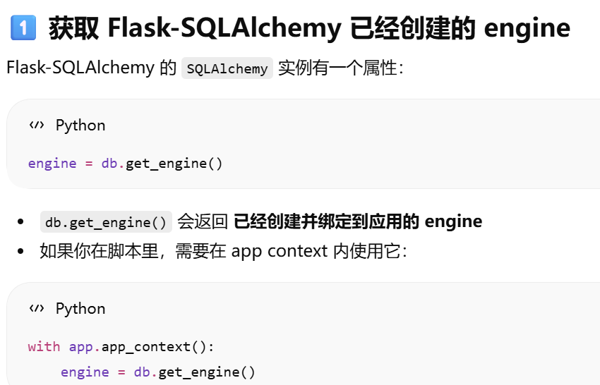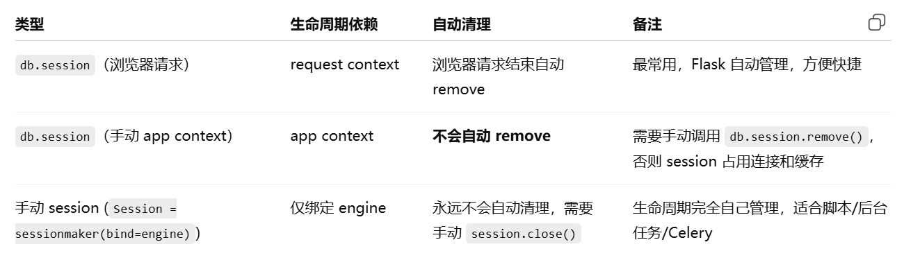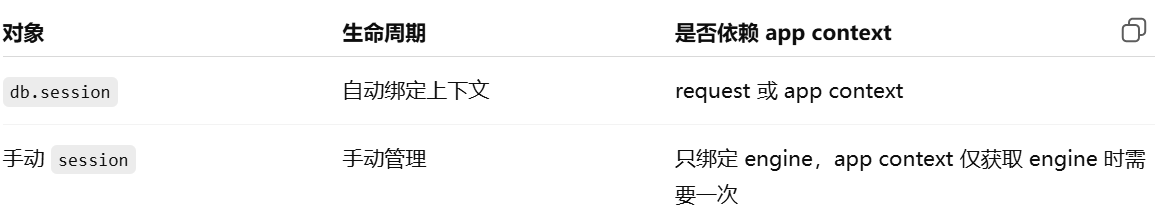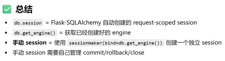- [Flask-SQLAlchemy 已经自动创建了 engine 和 db.session,如果我想自己手动创建一个新的 session,但还是用这个 engine,该怎么操作?](#Flask-SQLAlchemy 已经自动创建了 engine 和 db.session,如果我想自己手动创建一个新的 session,但还是用这个 engine,该怎么操作?)