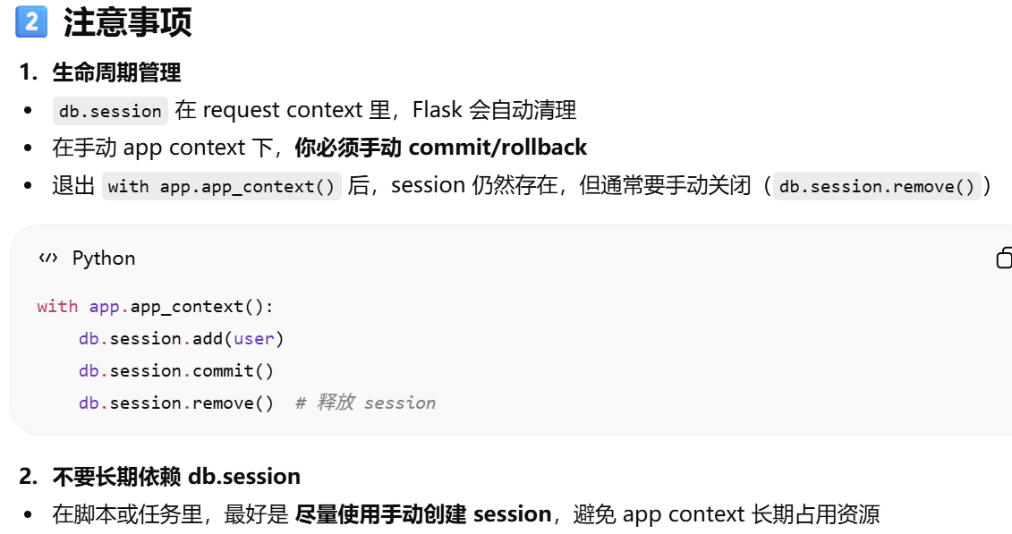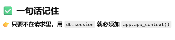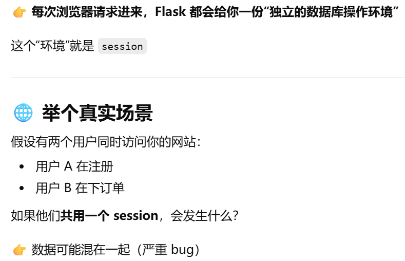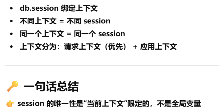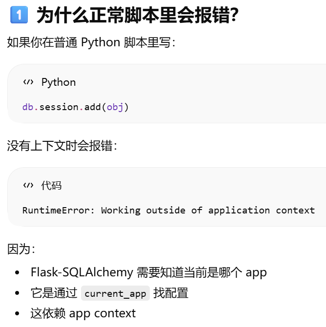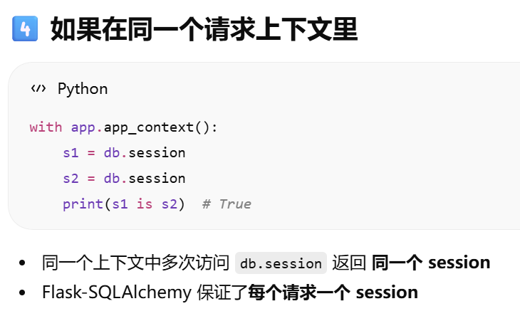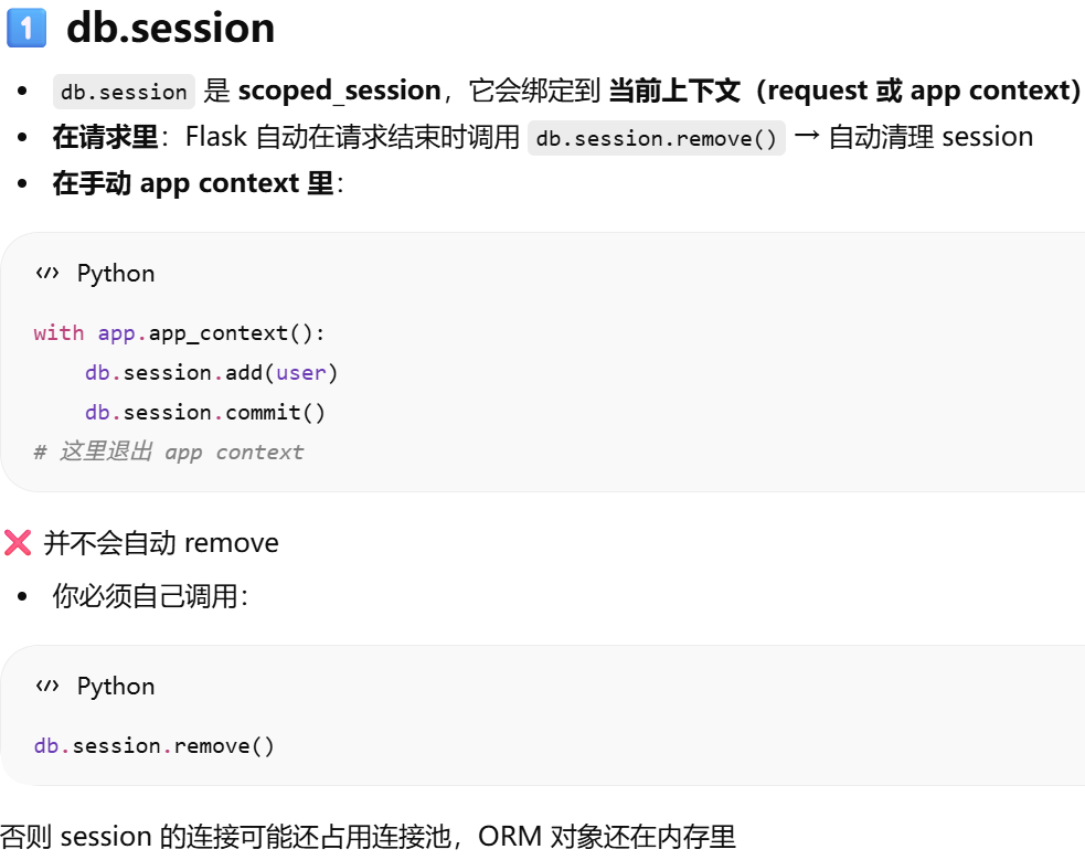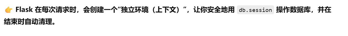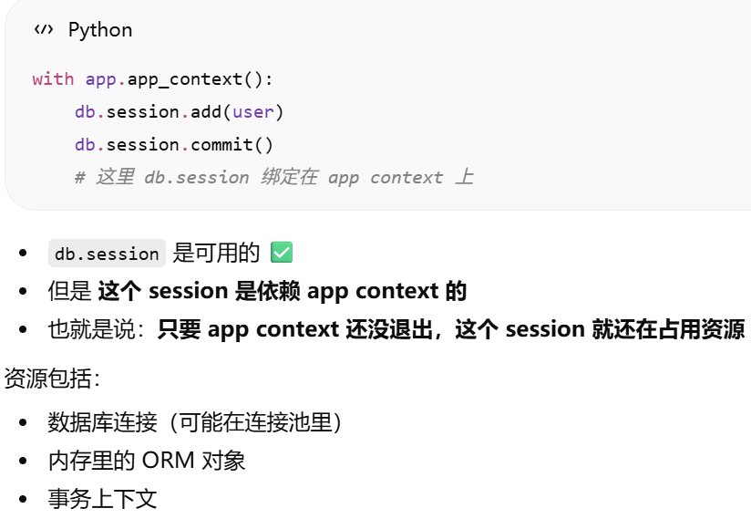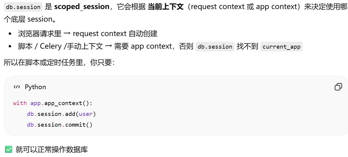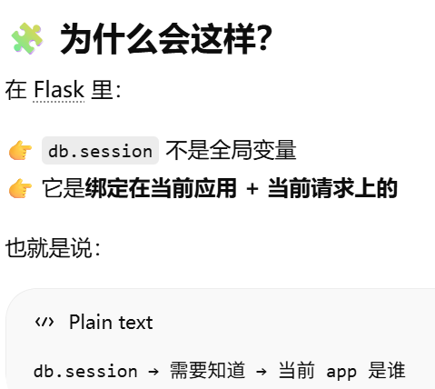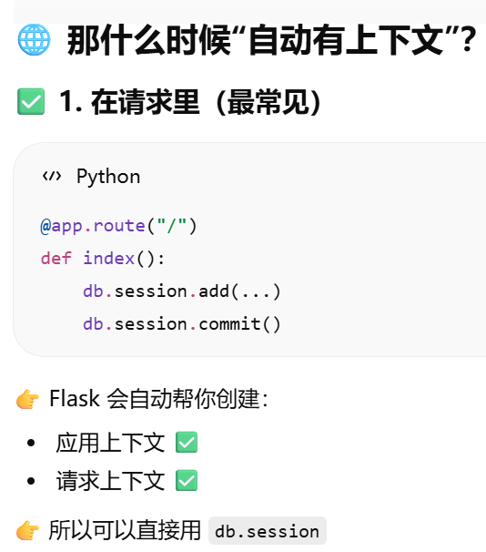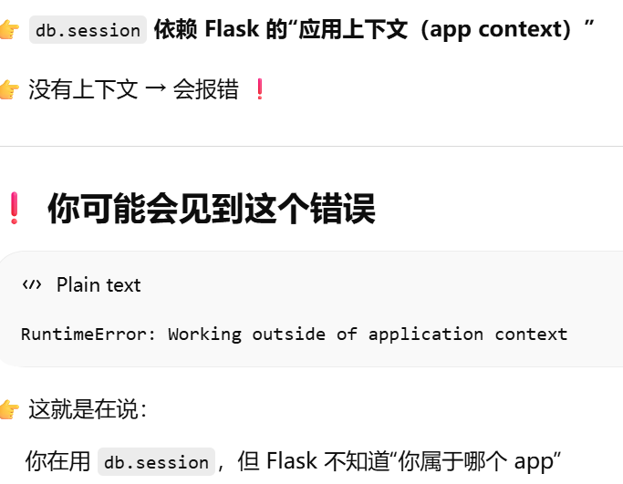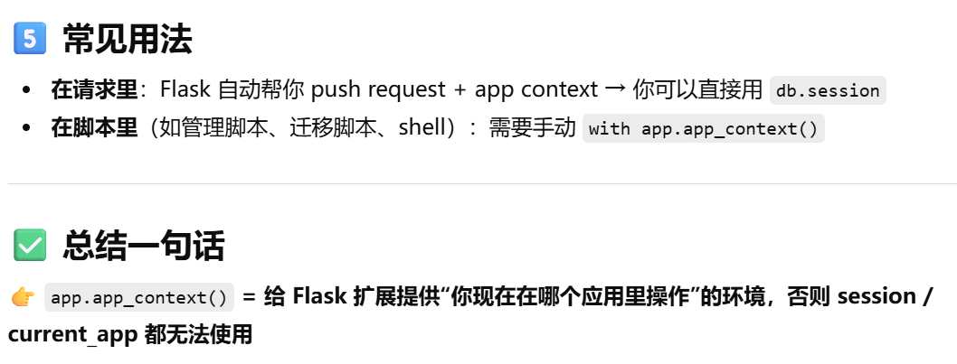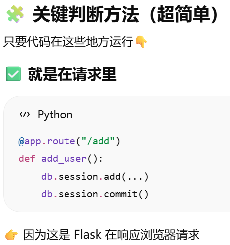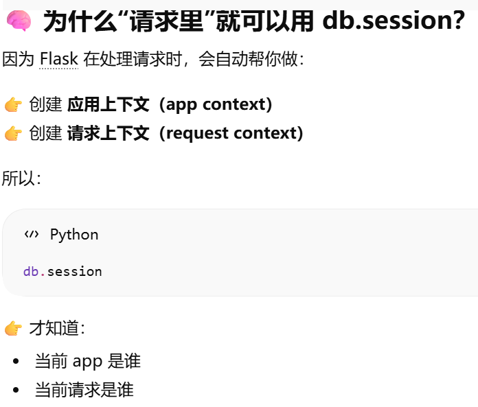 - [db.session = "当前请求专属的数据库会话"。只要不在请求里,用 db.session 就必须加 app.app_context()](#db.session = “当前请求专属的数据库会话”。只要不在请求里,用 db.session 就必须加 app.app_context())