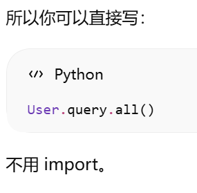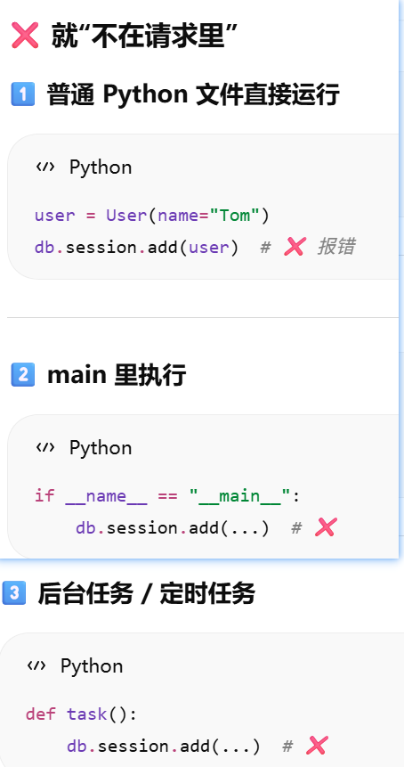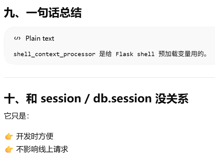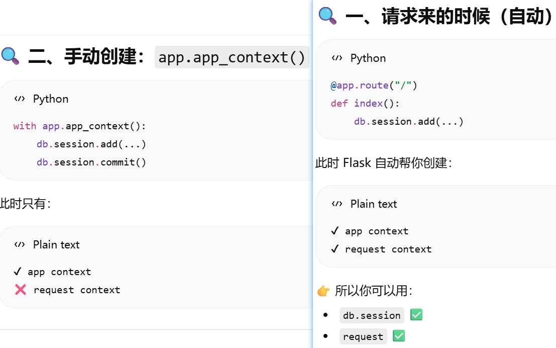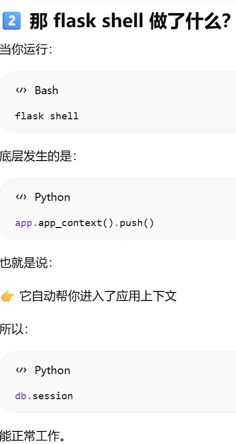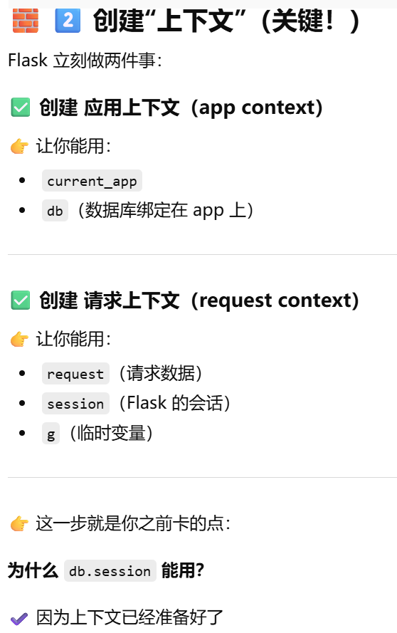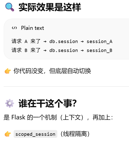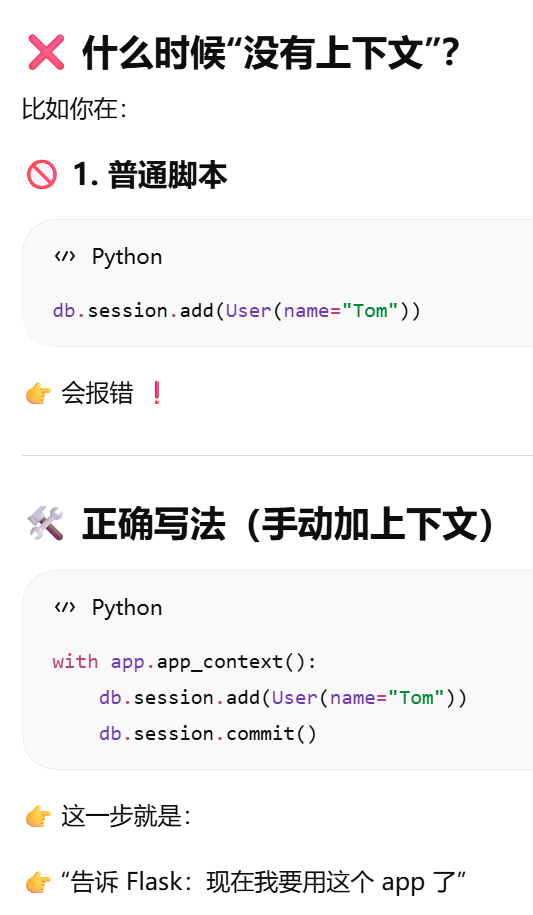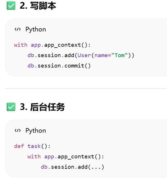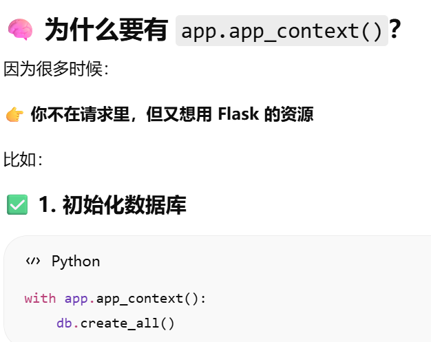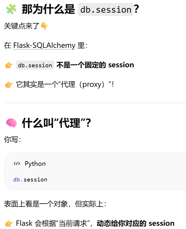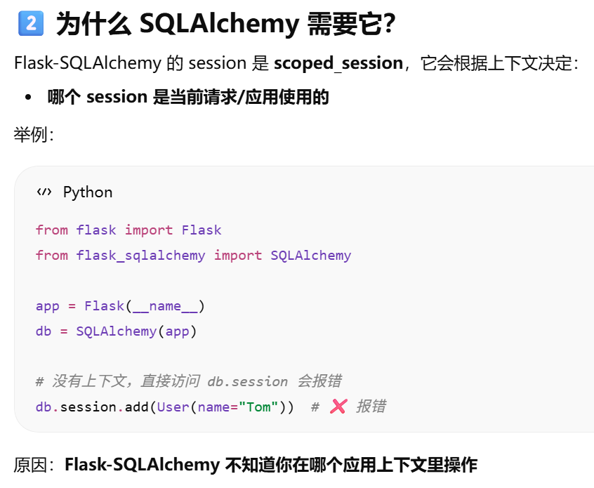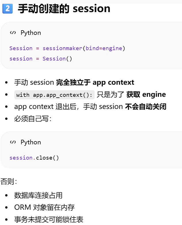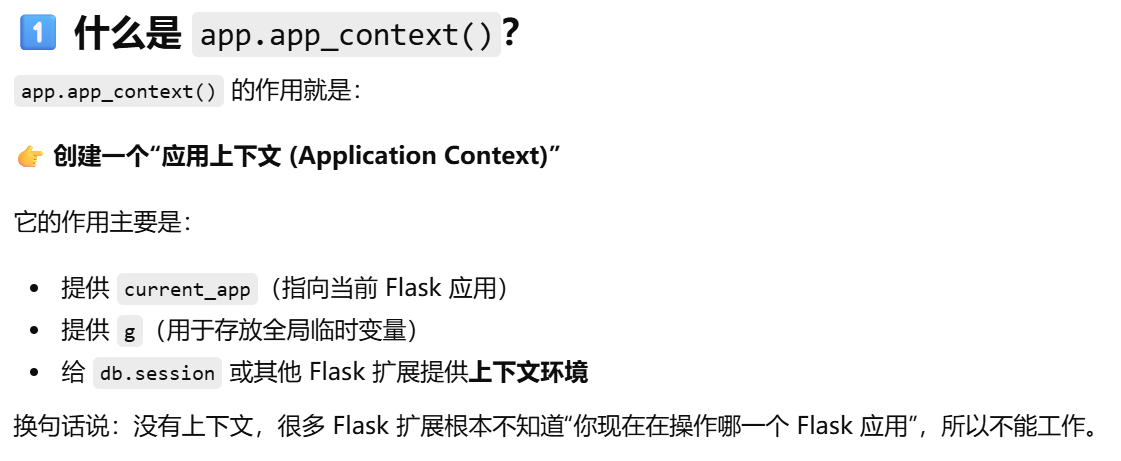 - [db.session = "当前请求专属的数据库会话"。只要不在请求里,用 db.session 就必须加 app.app_context()](#db.session = “当前请求专属的数据库会话”。只要不在请求里,用 db.session 就必须加 app.app_context())
