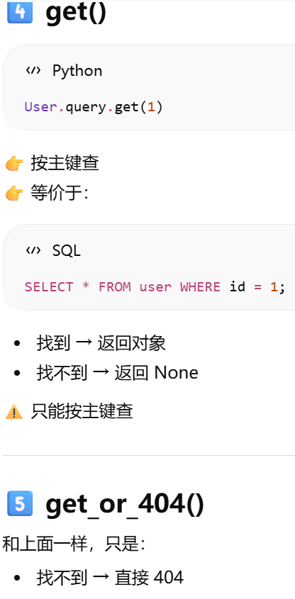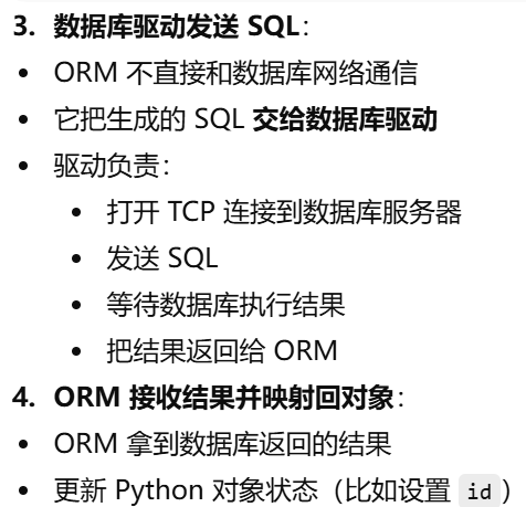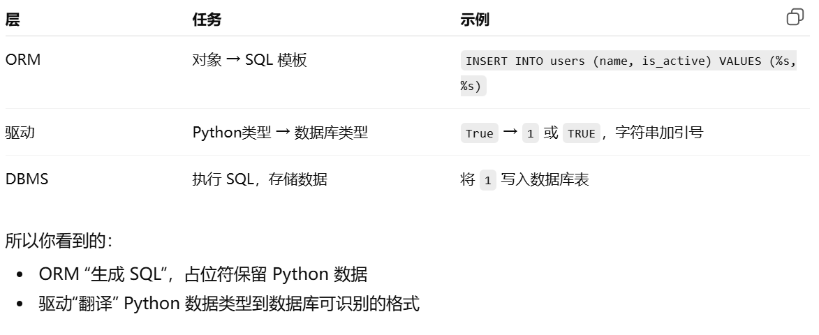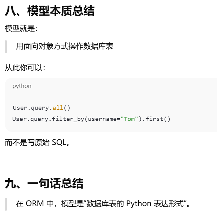 - [模型 = 用 Python 类表示数据库表。模型就是用面向对象方式操作数据库表。在 ORM 里:一个类 → 一张表。类的属性 → 表的列。类的实例 → 表中的一行数据](#模型 = 用 Python 类表示数据库表。模型就是用面向对象方式操作数据库表。在 ORM 里:一个类 → 一张表。类的属性 → 表的列。类的实例 → 表中的一行数据)