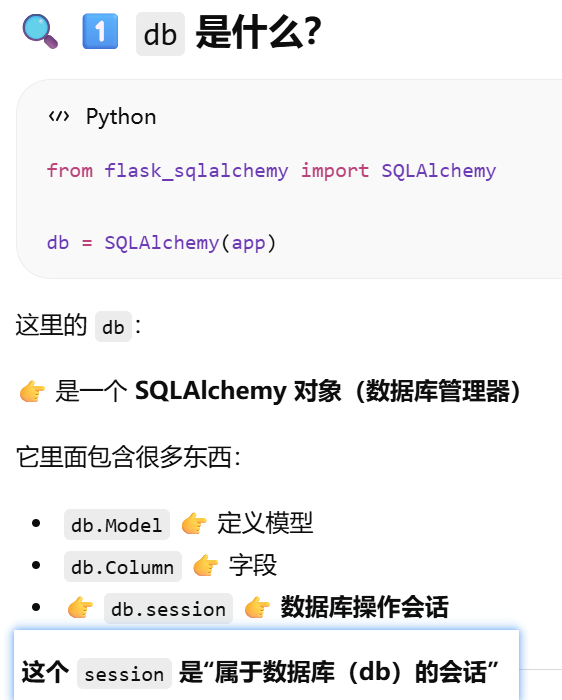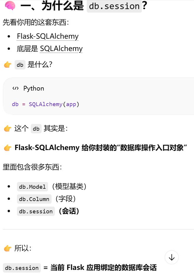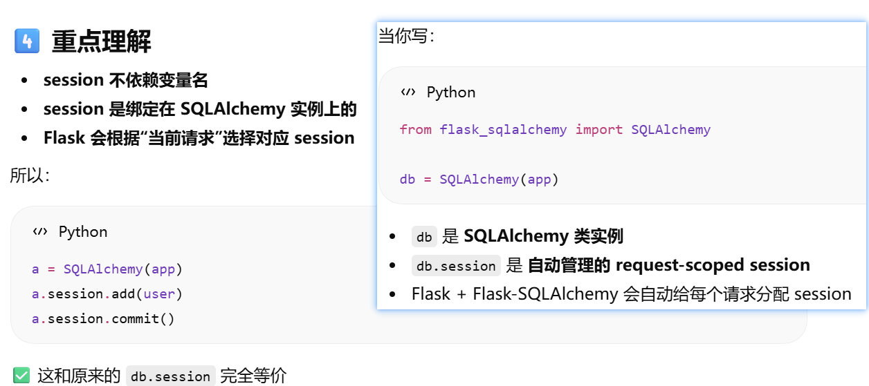 - [为什么是 db.session?当前 Flask 应用绑定的数据库db,操作的会话](#为什么是 db.session?当前 Flask 应用绑定的数据库db,操作的会话)