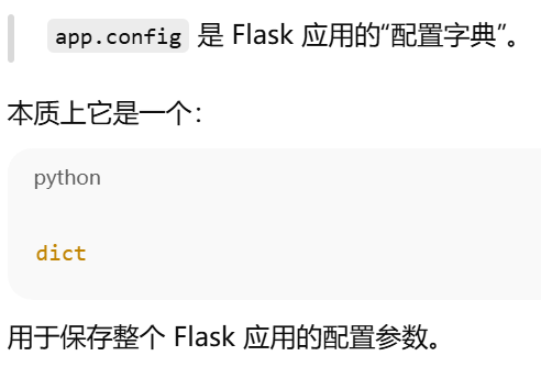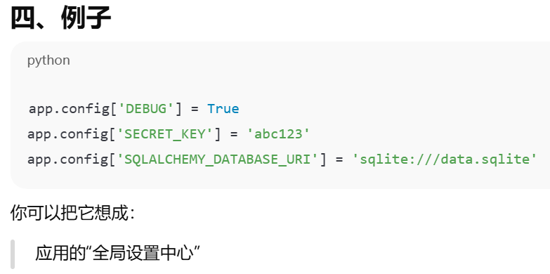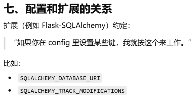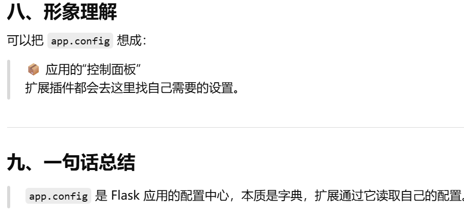 - [app.config 是 Flask 应用的"配置字典"。应用的全局设置中心。扩展通过它读取自己的配置](#app.config 是 Flask 应用的“配置字典”。应用的全局设置中心。扩展通过它读取自己的配置)