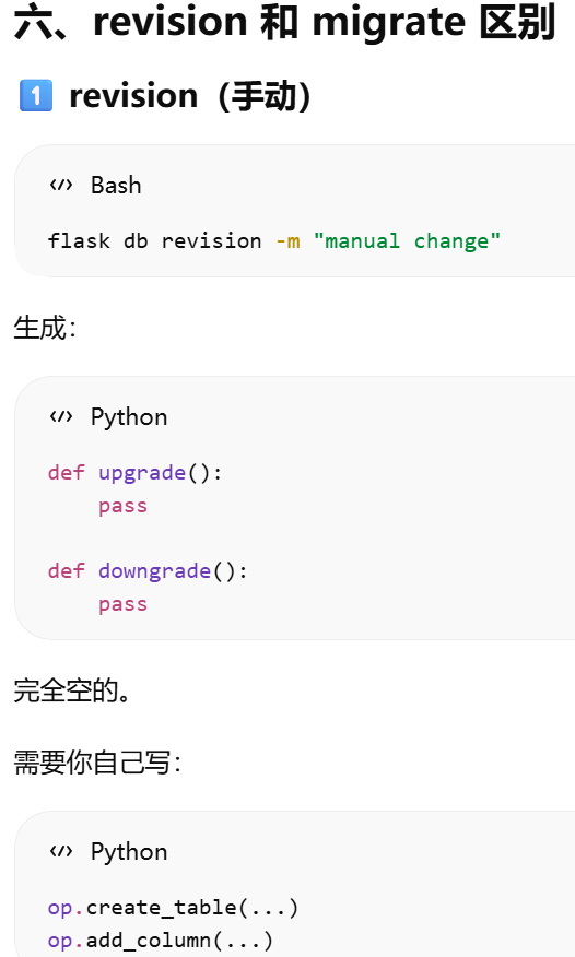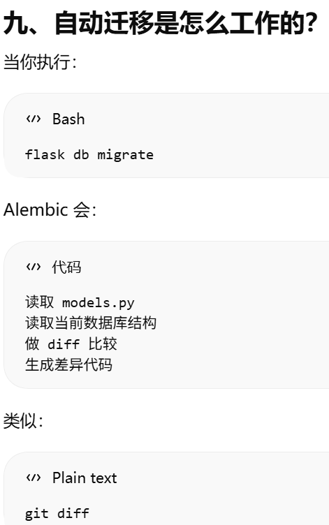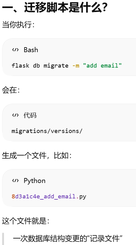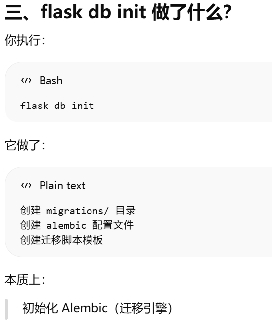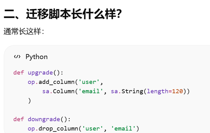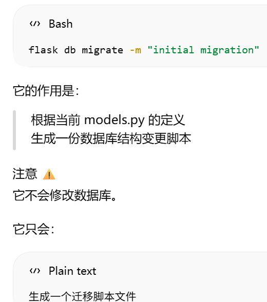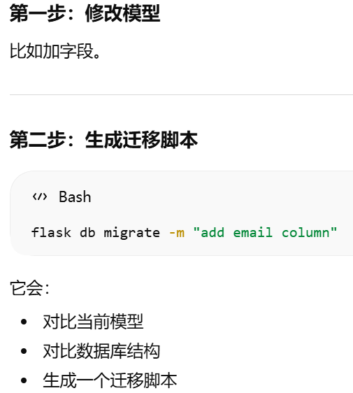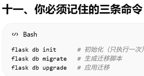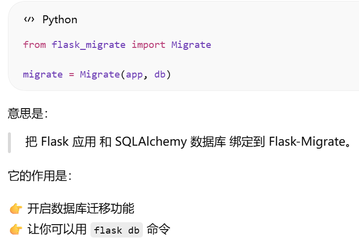 migrate = Migrate(app, db)把 Flask 应用 和 SQLAlchemy 数据库 绑定到 Flask-Migrate。
