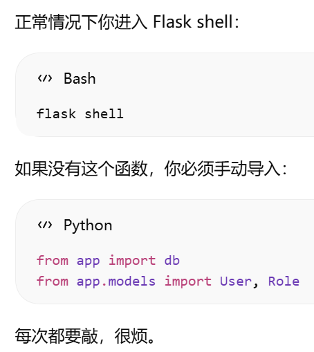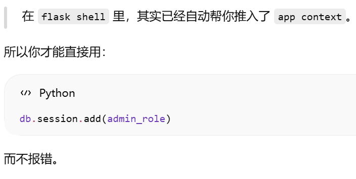 - [在 flask shell 里,其实已经自动帮你推入了 app context。所以你才能直接用:db.session.add(admin_role)而不报错。](#在 flask shell 里,其实已经自动帮你推入了 app context。所以你才能直接用:db.session.add(admin_role)而不报错。)
