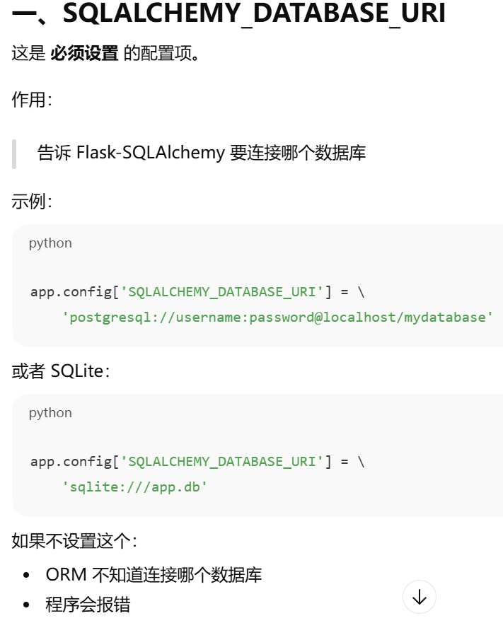 - [SQLALCHEMY_DATABASE_URI,告诉 Flask-SQLAlchemy 要连接哪个数据库](#SQLALCHEMY_DATABASE_URI,告诉 Flask-SQLAlchemy 要连接哪个数据库)