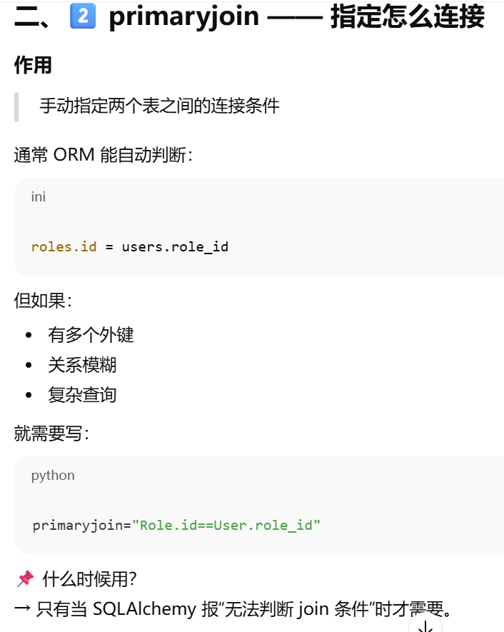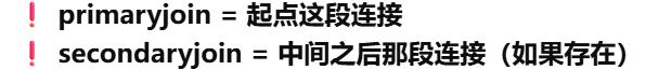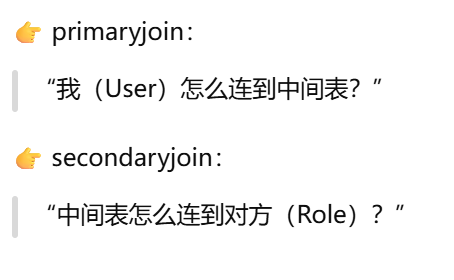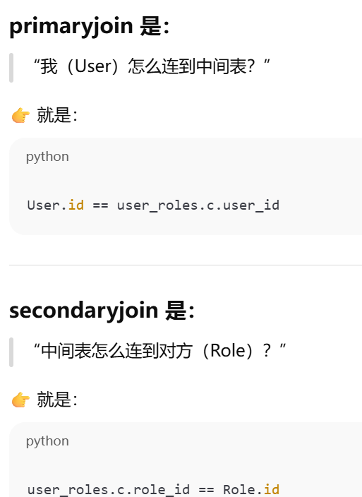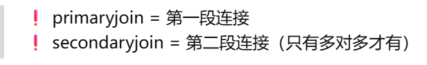 primaryjoin 是指 第一段连接,不一定是怎么和中间表连,只有多对多才是怎么和第一张表连,一对多就是怎么 和对方连。secondaryjoin = 第二段连接(只有多对多才有)