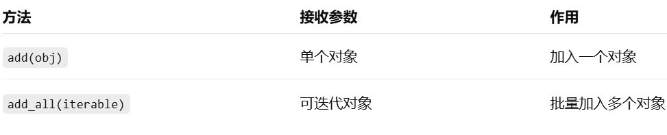 - add_all,参数是一个"可迭代对象"(iterable)