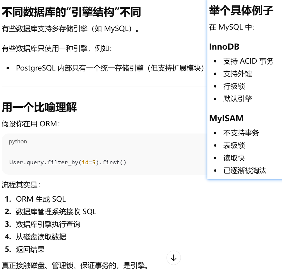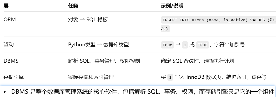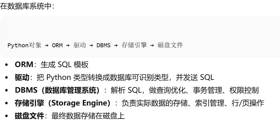- [Python对象 → ORM → 驱动 → DBMS → 存储引擎 → 磁盘文件](#Python对象 → ORM → 驱动 → DBMS → 存储引擎 → 磁盘文件)