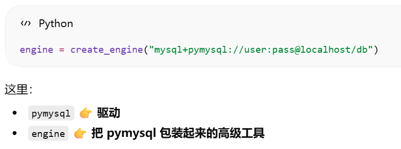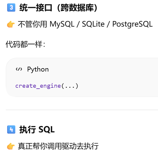 - [引擎:是 SQLAlchemy 在数据库驱动之上的一层封装](#引擎:是 SQLAlchemy 在数据库驱动之上的一层封装)