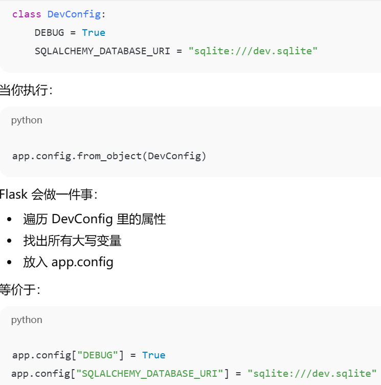 - [app.config.from_object(xx)加载对应配置类里的设置到 app.config字段](#app.config.from_object(xx)加载对应配置类里的设置到 app.config字段)