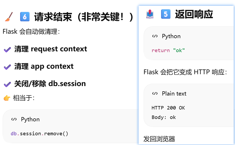 浏览器请求 → Flask → db.session → 数据库 请求结束: