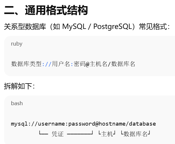 - [什么是数据库 URL?一种用字符串描述"如何连接数据库"的标准格式](#什么是数据库 URL?一种用字符串描述“如何连接数据库”的标准格式)