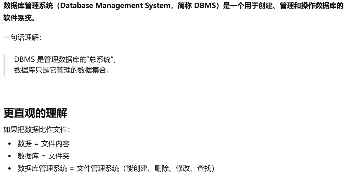 - 数据库管理系统:创建、管理和操作数据库的完整软件系统