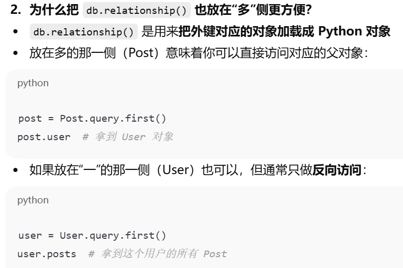 - 把外键和db.relationship()都放在"多"这一侧