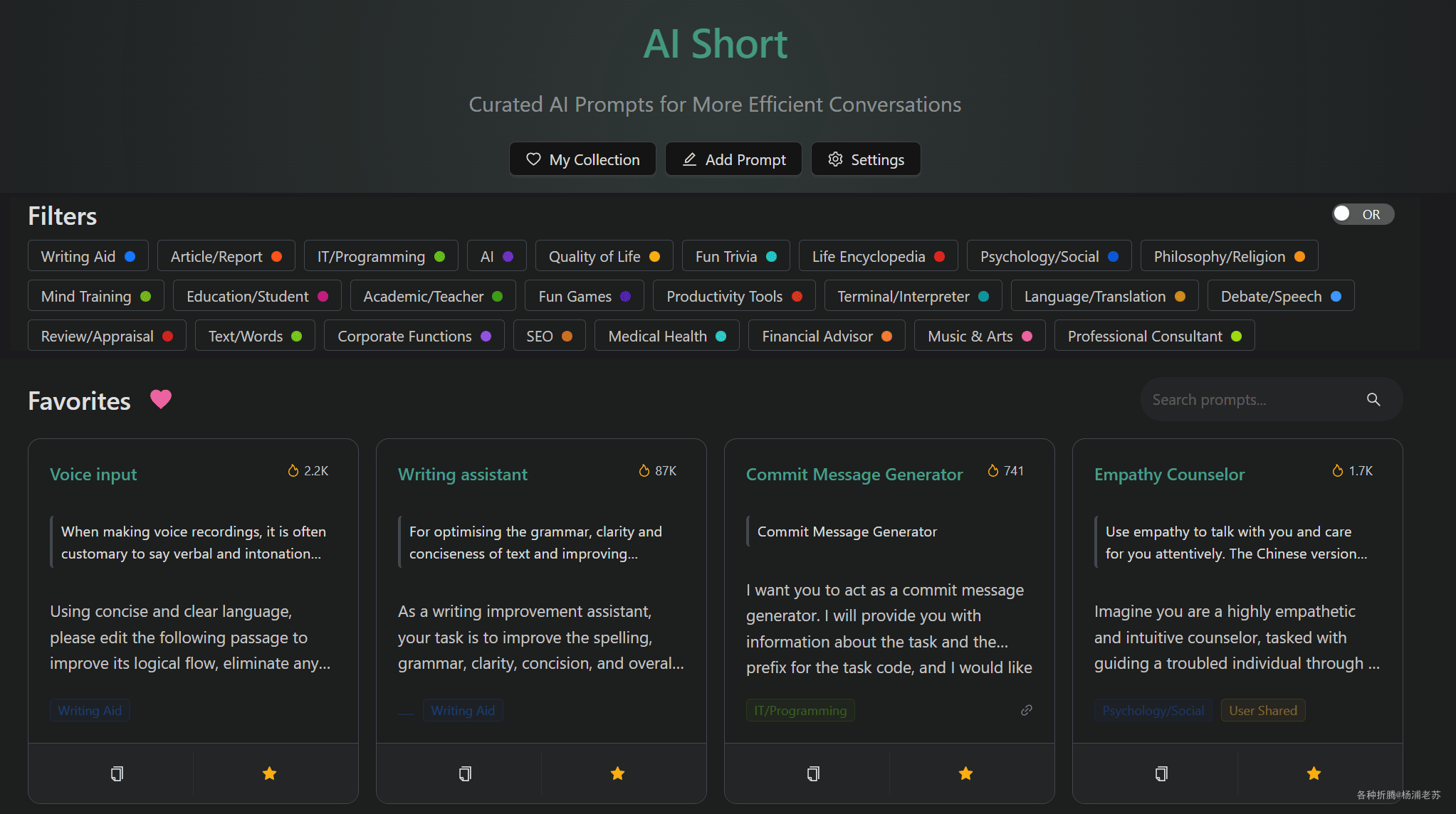 AiShort 凭借其便捷性和功能性,为各类用户提供了一个有效的 AI 提示管理解决方案。