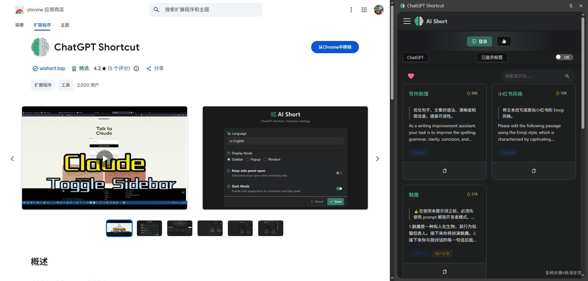 Chrome/Edge/Firefox扩展,通过快捷键Alt+Shift+S即可在任何网页唤出侧边栏,随时使用。 - 社区分享:用户可以分享、发现和评价来自社区的优秀提示词。