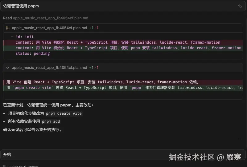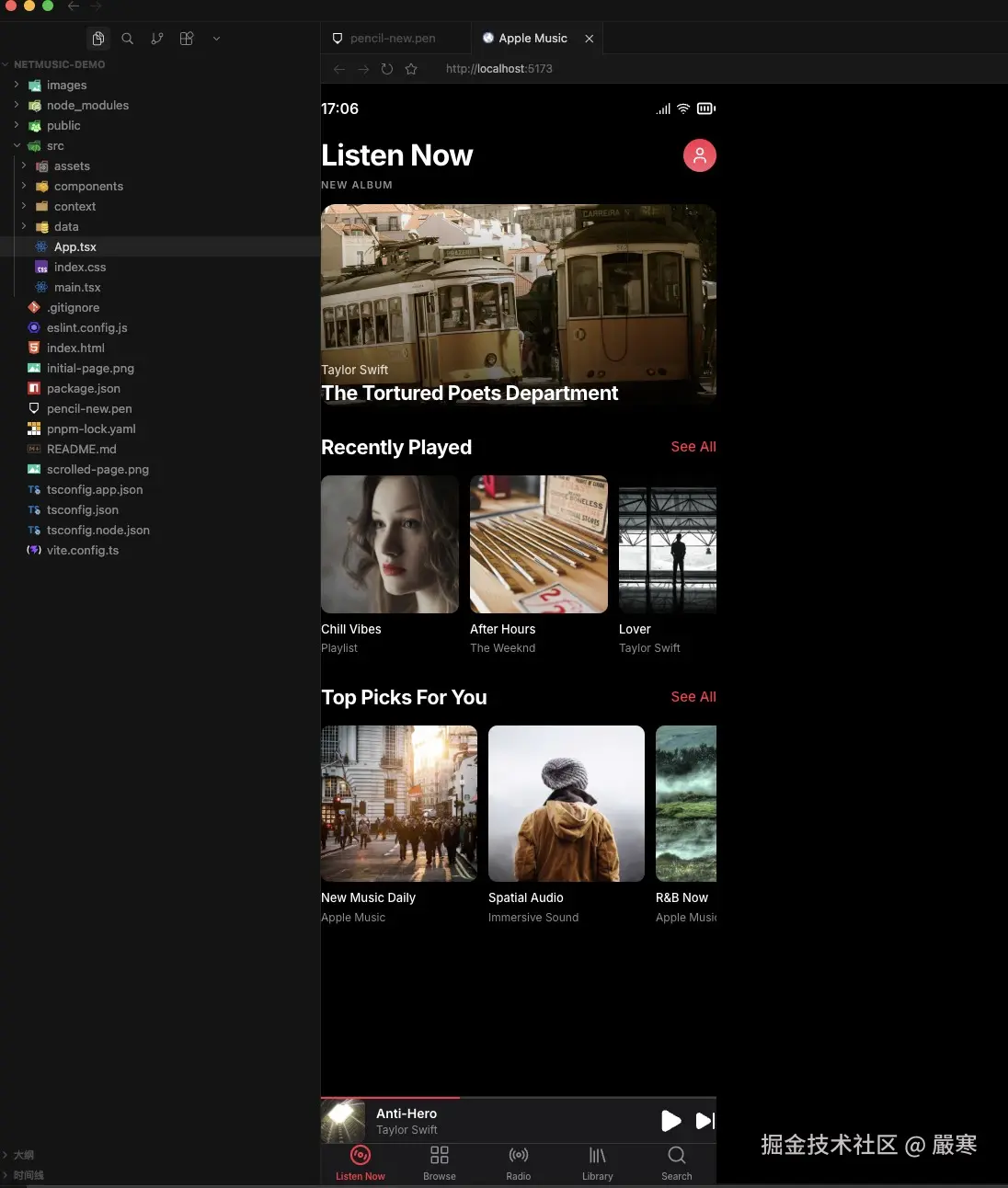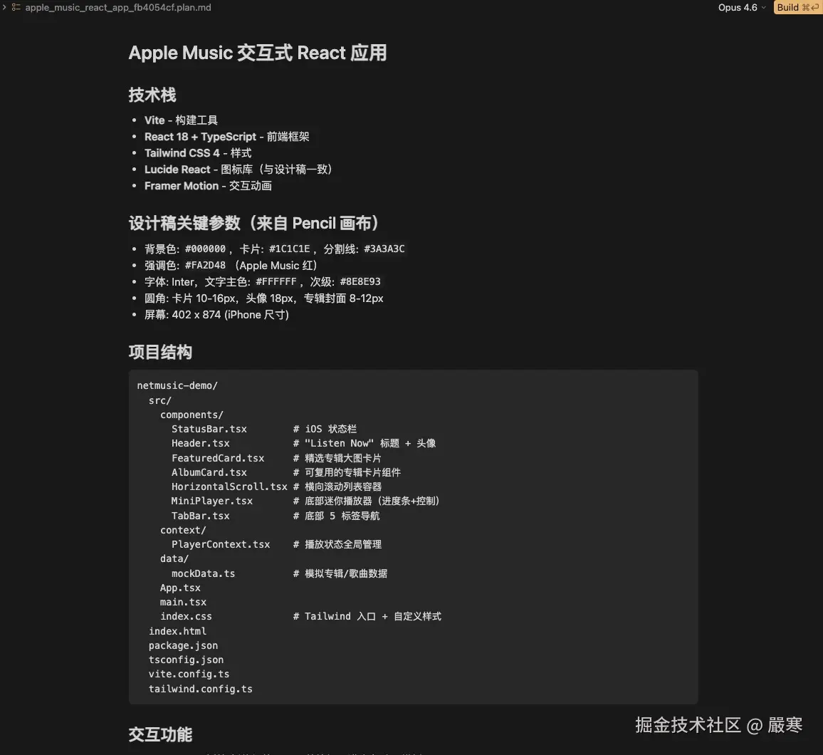 从"我想要一个 Apple Music 的界面"到"一个可运行的 React 应用",全程在一个编辑器里完成,没切换任何工具。这种体验确实让我看到了 AI 辅助开发的另一种可能。