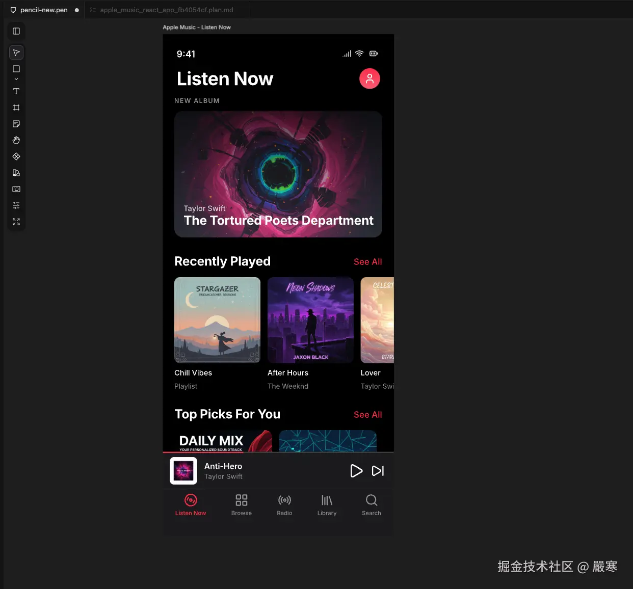 整个过程下来,Figma 没开、CSS 没手写、设计参数也不用自己量。我拿 Apple Music 的界面做了个实验,效果还真挺像那么回事。