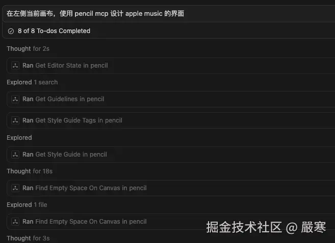 整个过程中,AI 会严格对照设计稿里的参数------颜色用设计稿里的色值,圆角用设计稿里的数值,间距也是。这就是 Pencil 的核心价值:设计参数和代码实现之间有了一条自动化的桥梁。