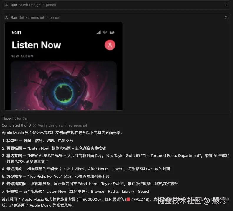 就这么一句话,AI 就开始在画布上构建 Apple Music 的移动端界面了。几十秒后,你会看到设计完成的提示: