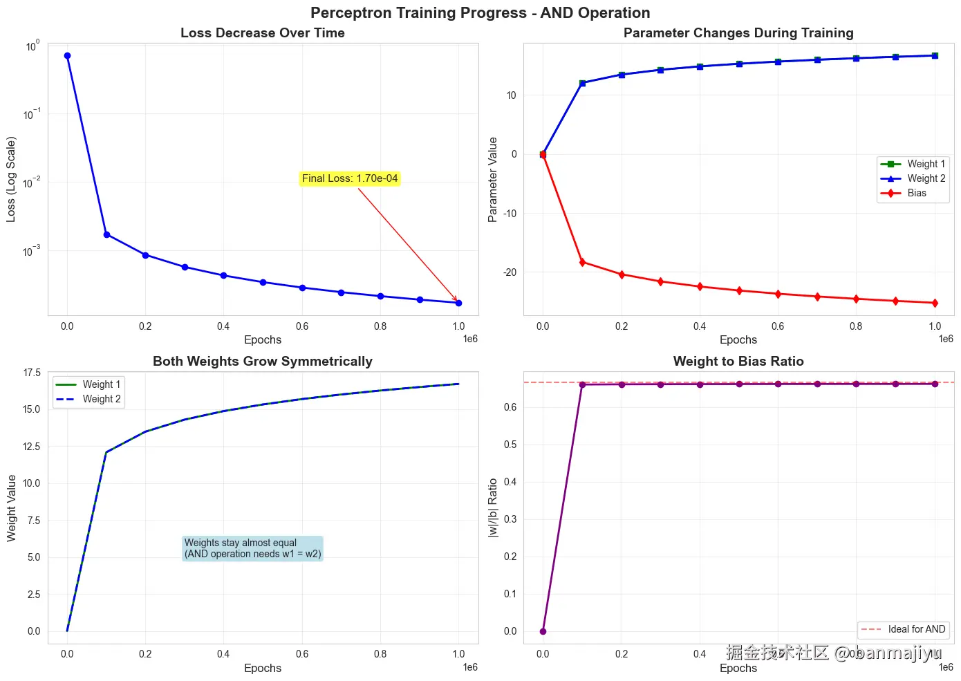 通过迭代优化权重和偏置,使模型能够正确分类样本