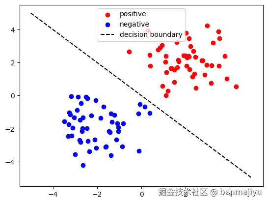 假设样本特征为 <math xmlns="http://www.w3.org/1998/Math/MathML"> x = [ x 1 , x 2 ] T \boldsymbol{x} = [x_1, x_2]^T </math>x=[x1,x2]T,标签 <math xmlns="http://www.w3.org/1998/Math/MathML"> y ∈ { + 1 , − 1 } y \in \{+1, -1\} </math>y∈{+1,−1}。线性决策边界可表示为: <math xmlns="http://www.w3.org/1998/Math/MathML"> w T x + b = 0 \boldsymbol{w}^T \boldsymbol{x} + b = 0 </math>wTx+b=0