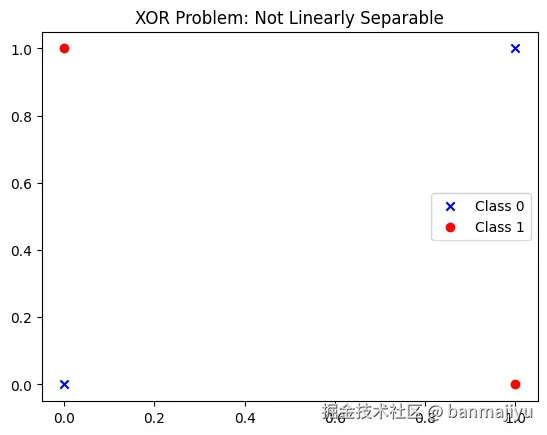 在二维平面上,样本点 <math xmlns="http://www.w3.org/1998/Math/MathML"> ( 0 , 0 ) (0,0) </math>(0,0)和 <math xmlns="http://www.w3.org/1998/Math/MathML"> ( 1 , 1 ) (1,1) </math>(1,1)属于一类, <math xmlns="http://www.w3.org/1998/Math/MathML"> ( 0 , 1 ) (0,1) </math>(0,1) 和 <math xmlns="http://www.w3.org/1998/Math/MathML"> ( 1 , 0 ) (1,0) </math>(1,0) 属于另一类。无法用一条直线分隔两类样本。