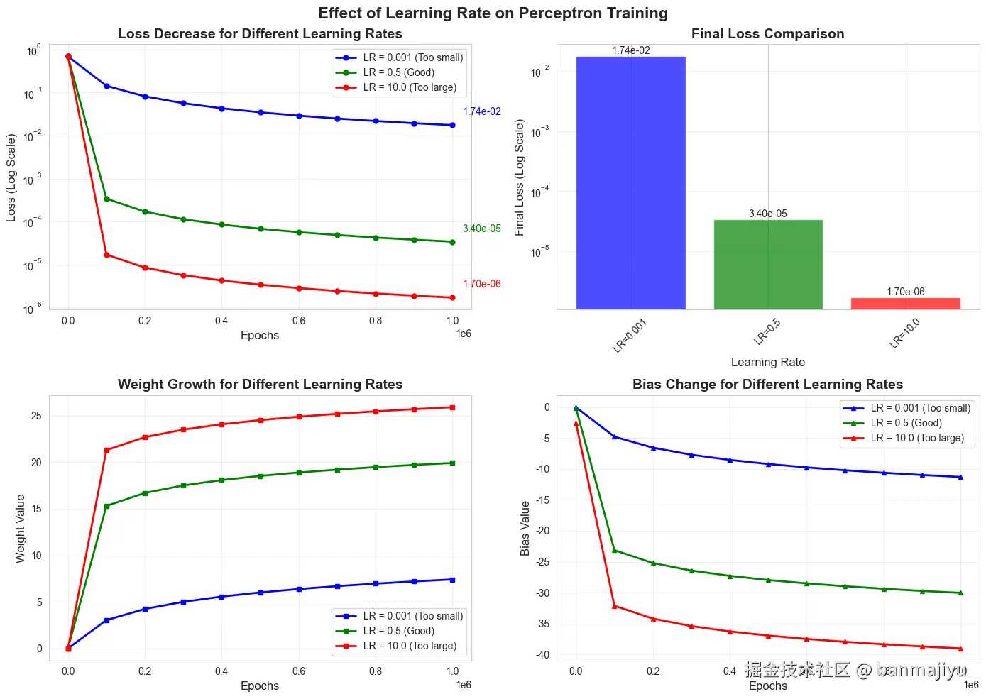 初始化:权重 <math xmlns="http://www.w3.org/1998/Math/MathML"> w \mathbf{w} </math>w 和偏置 <math xmlns="http://www.w3.org/1998/Math/MathML"> b b </math>b设为小随机数或零。