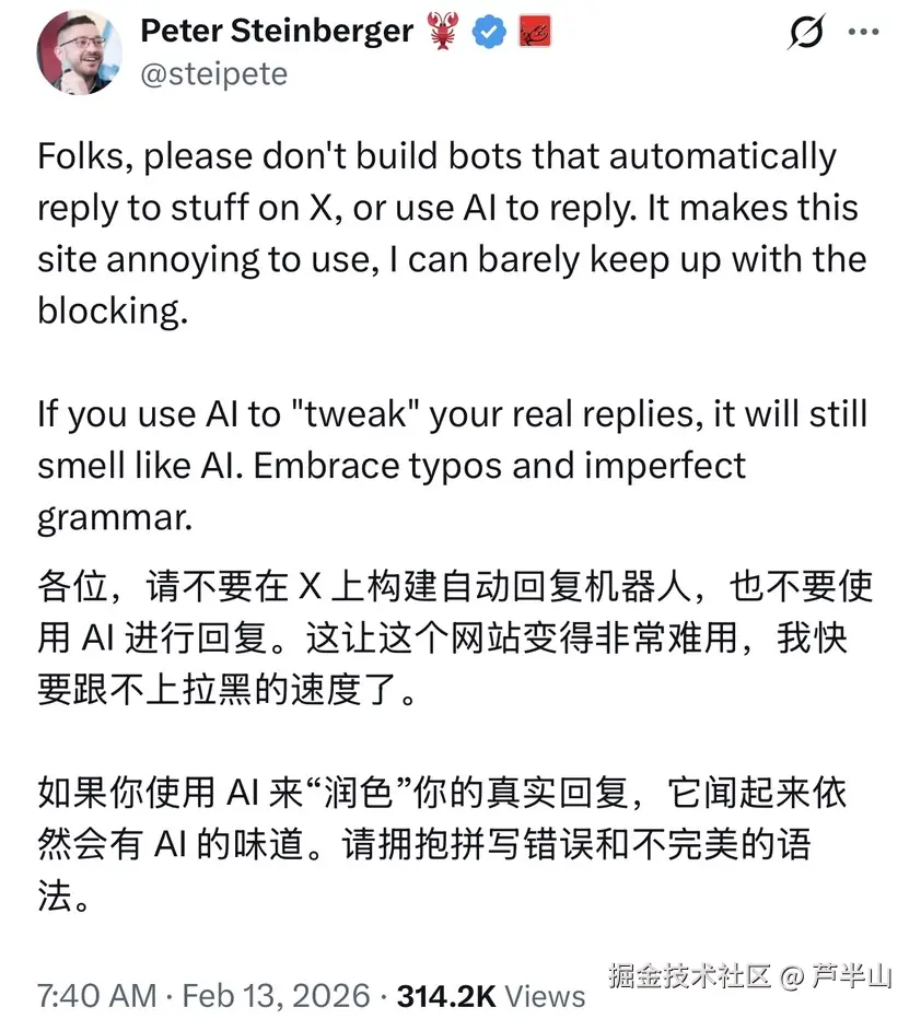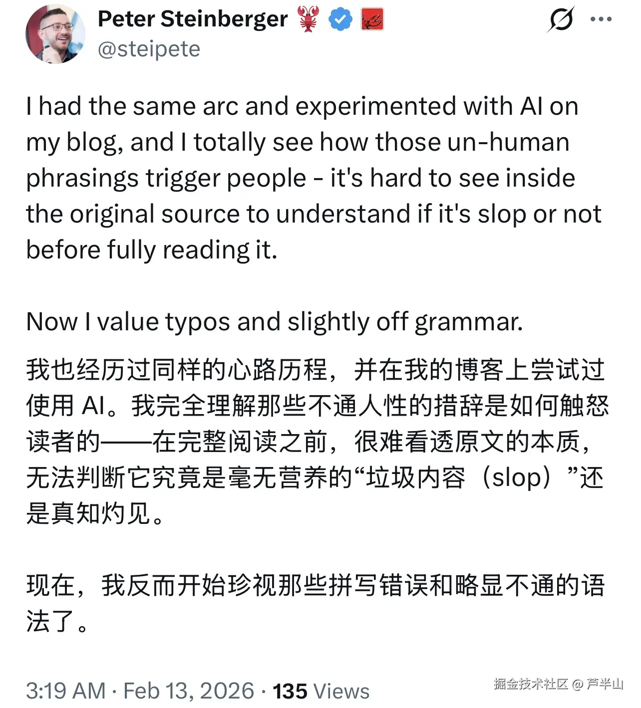 从去年开始,我写作的流程发生了变化。我会粗劣地写一个初稿,把想要讨论的话题和观点罗列一下,然后让AI理顺结构、润色文笔。起初,我也十分享受这个过程,因为它让写作的时间大大缩短。但互联网上AI生成的内容开始指数爆炸,它们充斥着AI的味道,让人开始生厌。OpenClaw的作者Peter Steinberger也多次表达过类似的观点。