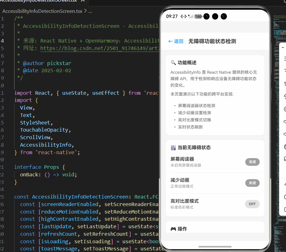- [鸿蒙跨平台实战:React Native在OpenHarmony上的AccessibilityInfo无障碍检测](#鸿蒙跨平台实战:React Native在OpenHarmony上的AccessibilityInfo无障碍检测)