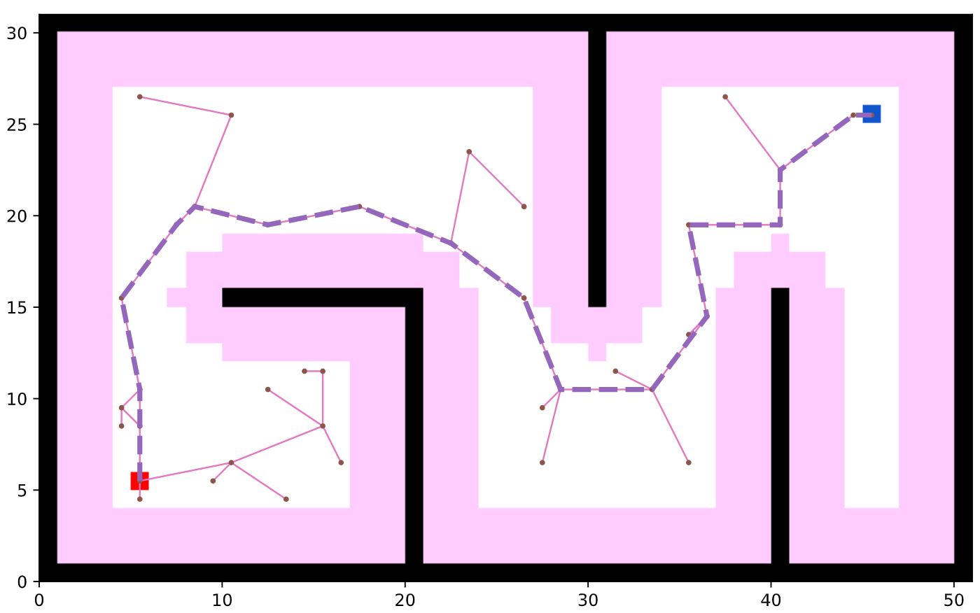 {'success': True, 'start': (5, 5), 'goal': (45, 25), 'length': 74.88933689304858, 'cost': 74.88933689304858, 'expand': {(5, 5): Node((5, 5), None, 0, 0), ...}}