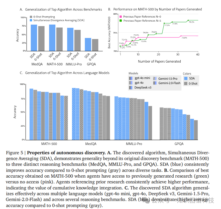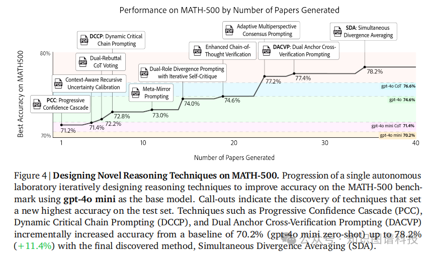 MATH-500基准测试:使用gpt-4o mini作为基础模型,每一代论文都显示出可衡量的改进。准确率从70.2%的基线稳步提升至78.2%(11.4%相对改进),采用了新发现的技术如同步发散平均(Simultaneous Divergence Averaging, SDA)