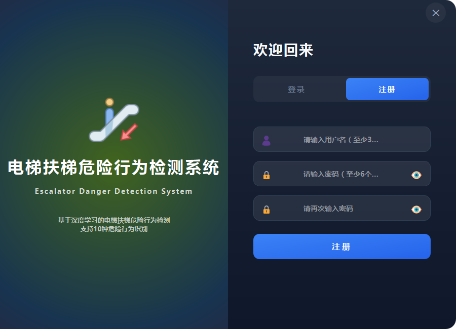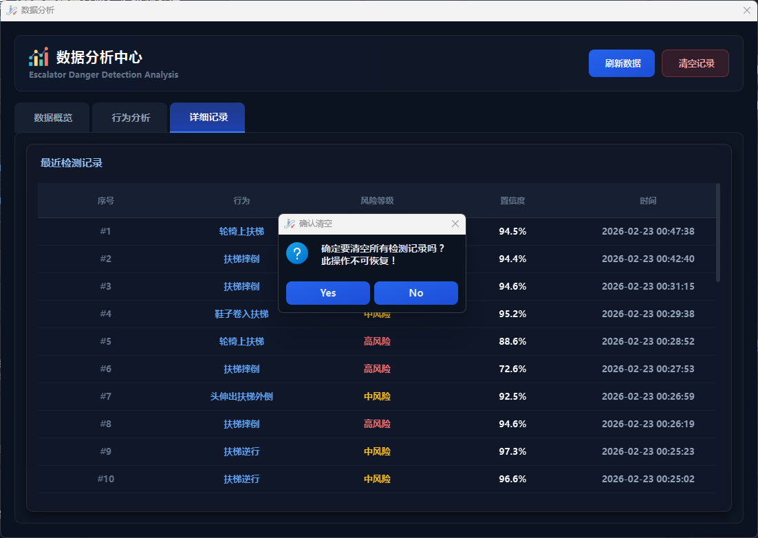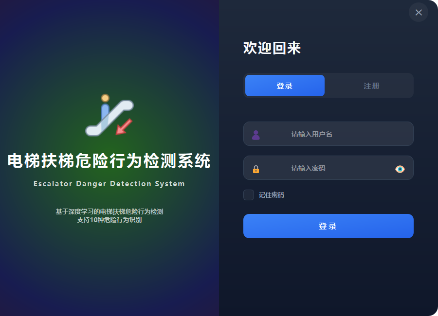 本系统基于YOLO11n深度学习模型,实现了电梯扶梯场景下扶梯逆行、扶梯摔倒、攀爬扶手、轮椅上扶梯、携带行李箱、婴儿车上扶梯、衣服卷入扶梯、手伸出扶梯外侧、头伸出扶梯外侧、鞋子卷入扶梯十类危险行为的智能检测与预警。系统采用PySide6构建图形用户界面,提供图片检测、视频检测、实时摄像头检测三种工作模式,并集成了三级风险评估、语音持续报警、数据统计分析、检测记录管理等功能,为电梯扶梯安全监控提供高效、可靠的技术支撑。