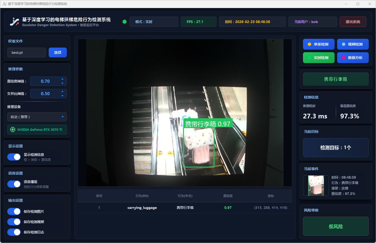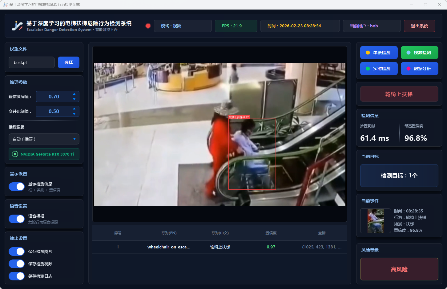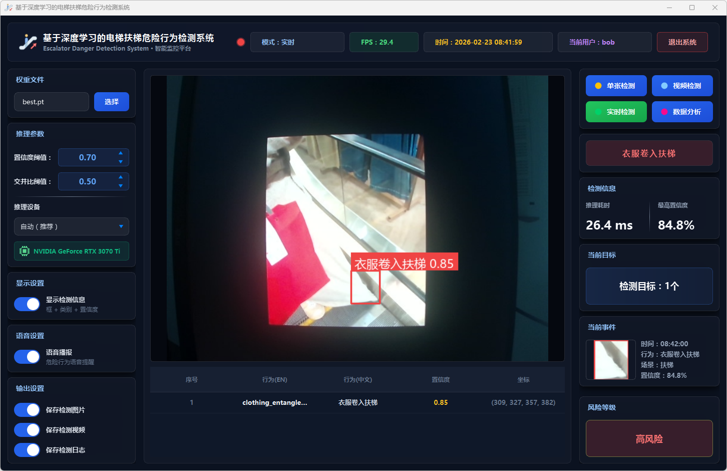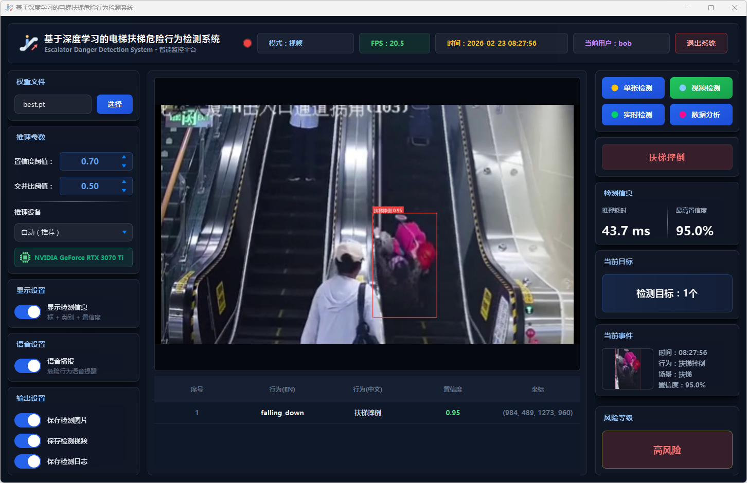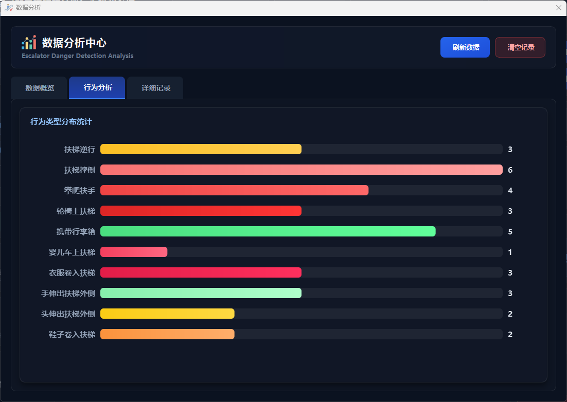 实验结果表明,本系统能够准确、实时地检测多种扶梯危险行为,风险分级预警机制合理有效,语音报警响应及时,数据分析功能为安全管理提供了可靠的数据支撑。该系统可部署于地铁站、商场等公共场所,辅助安保人员进行扶梯安全监控,具有良好的实际应用价值和推广前景。