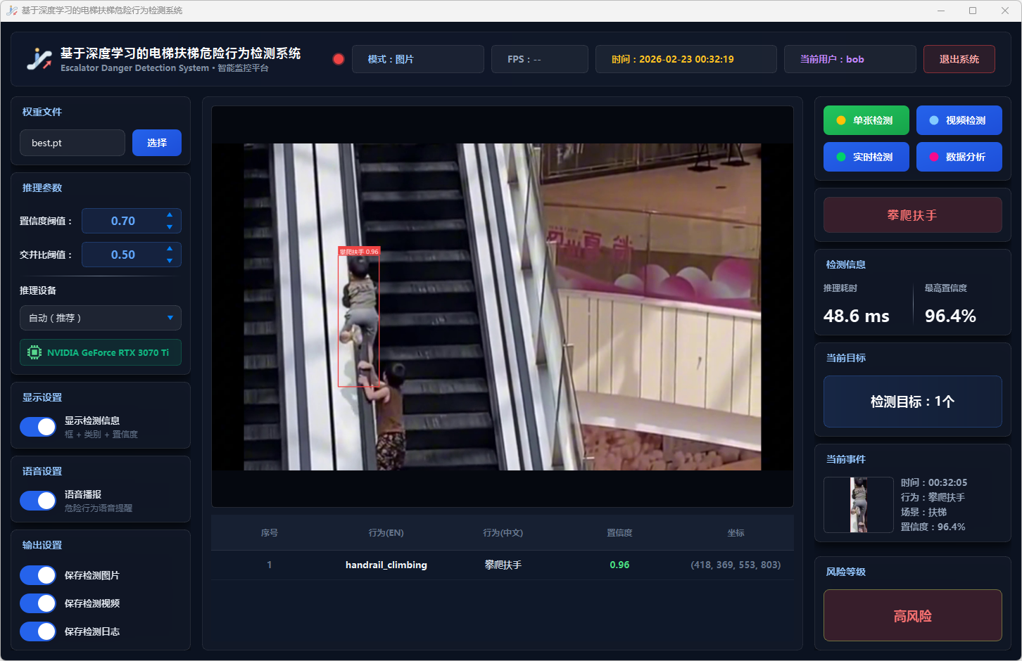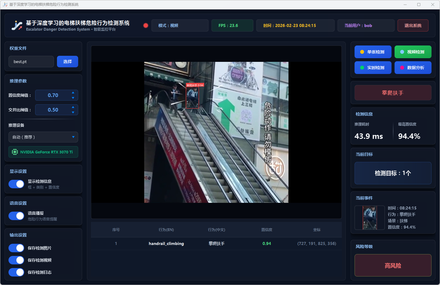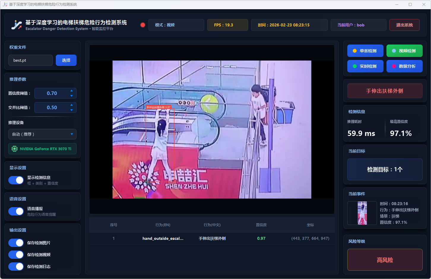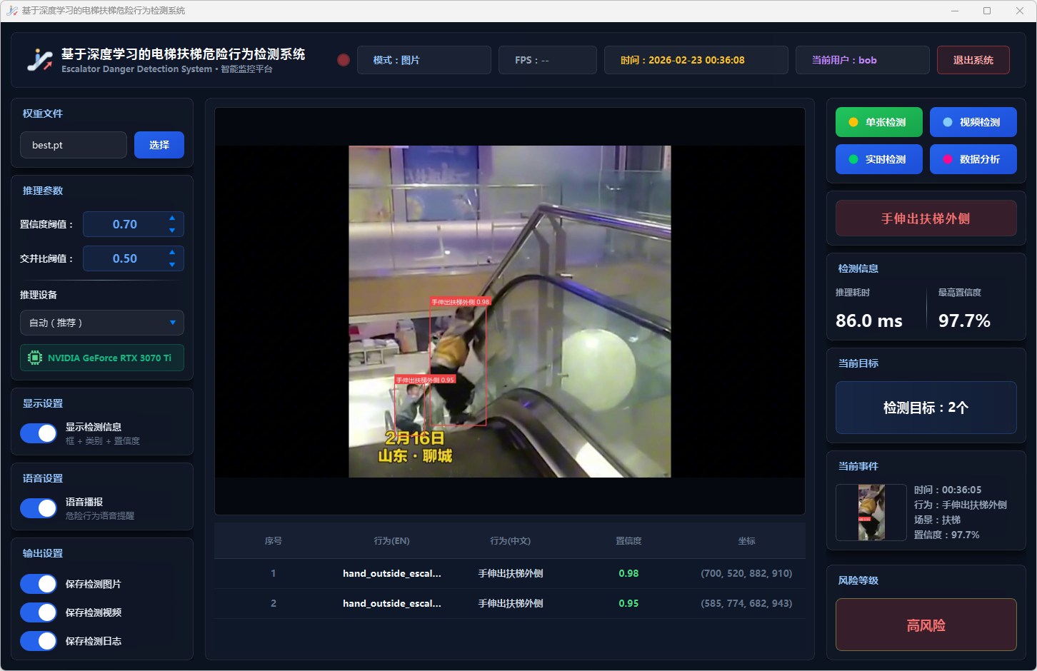 实验结果表明,本系统能够准确、实时地检测多种扶梯危险行为,风险分级预警机制合理有效,语音报警响应及时,数据分析功能为安全管理提供了可靠的数据支撑。该系统可部署于地铁站、商场等公共场所,辅助安保人员进行扶梯安全监控,具有良好的实际应用价值和推广前景。